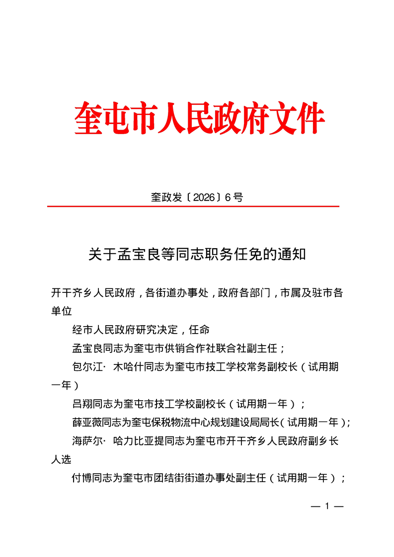 关于孟宝良等同志职务任免的通知 奎政发〔2026〕6号