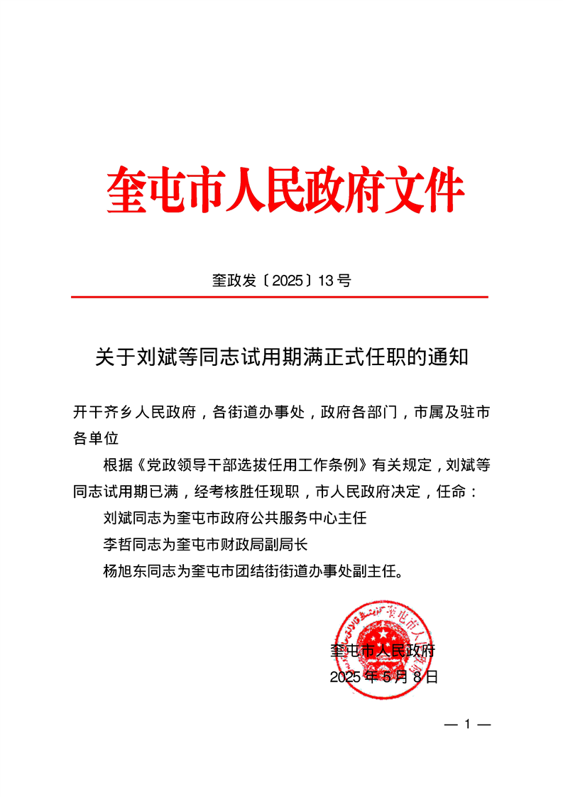 关于刘斌等同志试用期满正式任职的通知 奎政发〔2025〕13号
