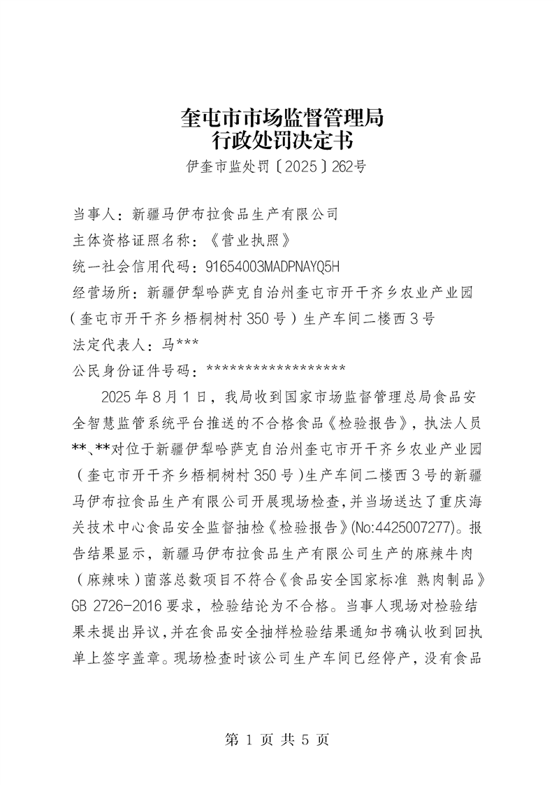 奎屯市市场监督管理局行政处罚决定书 伊奎市监处罚〔2025〕262号