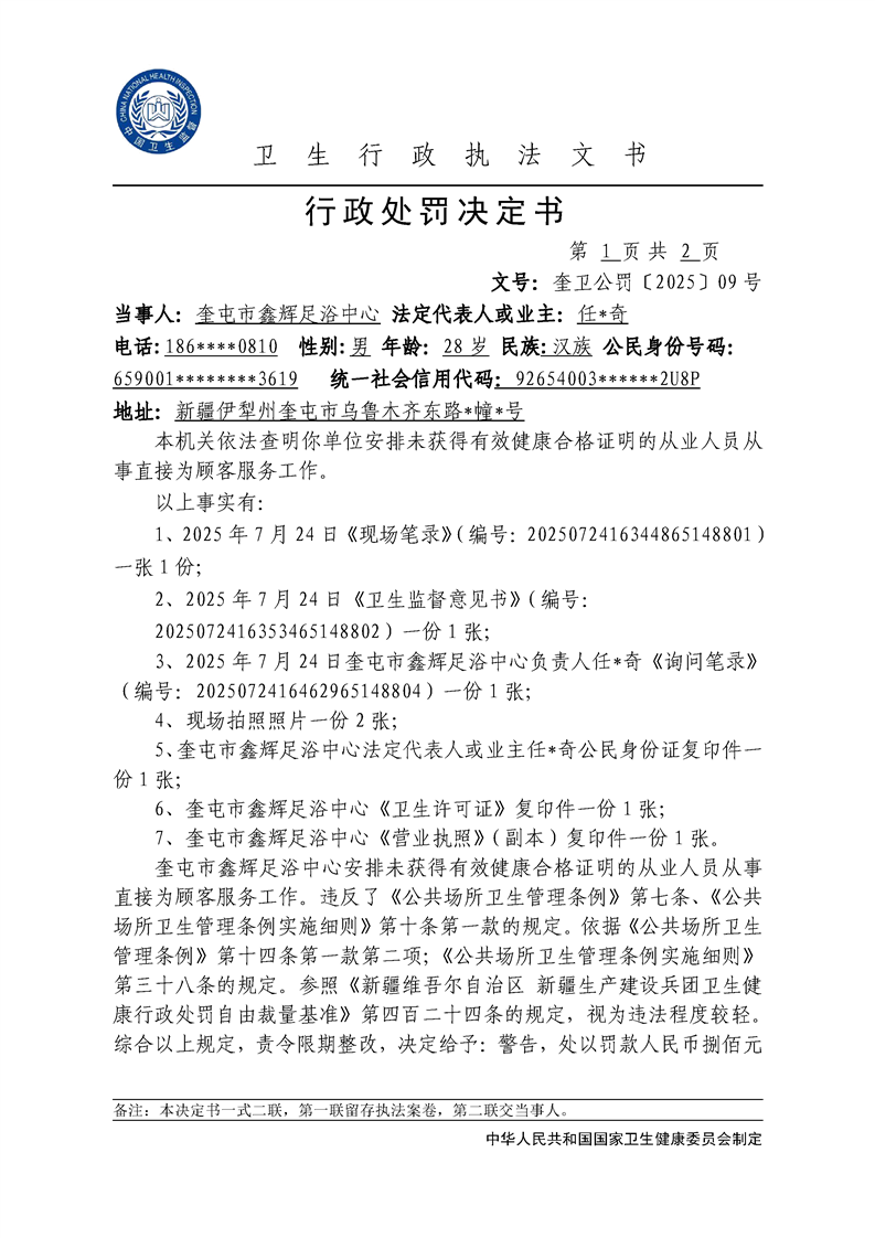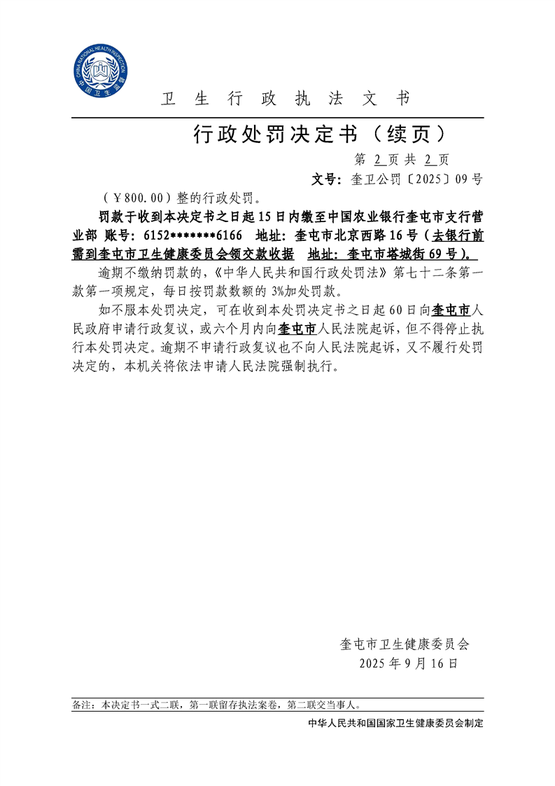 行政处罚决定书 奎卫公罚〔2025〕09号