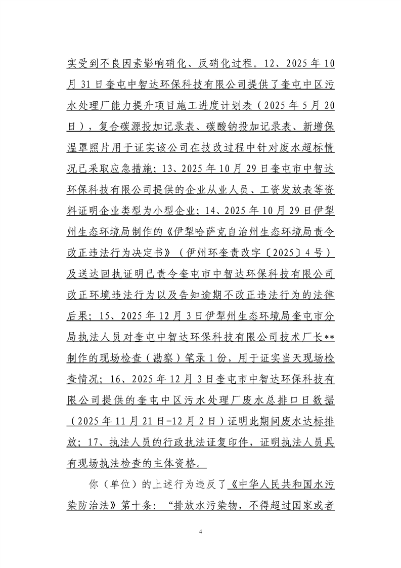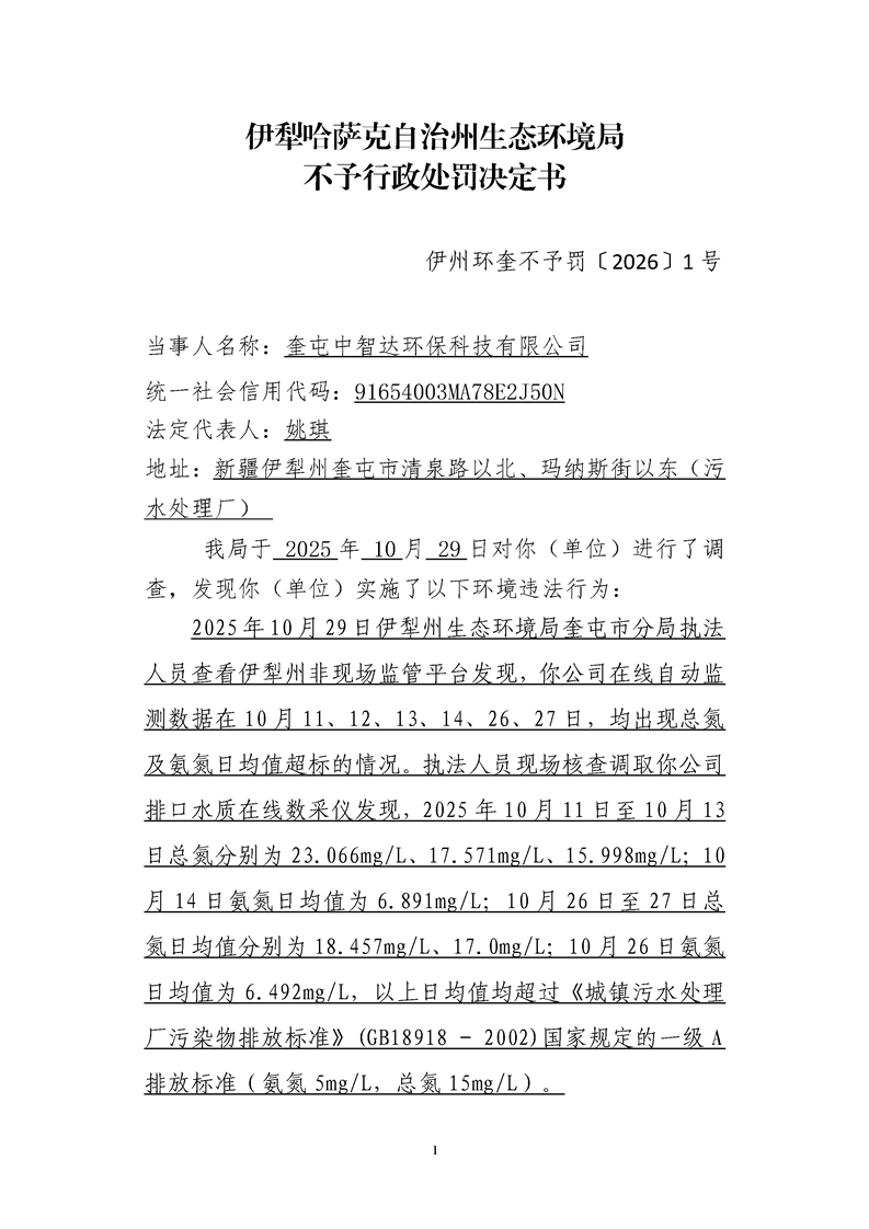 伊犁哈萨克自治州生态环境局不予行政处罚决定书 伊州环奎不予罚〔2026〕1号