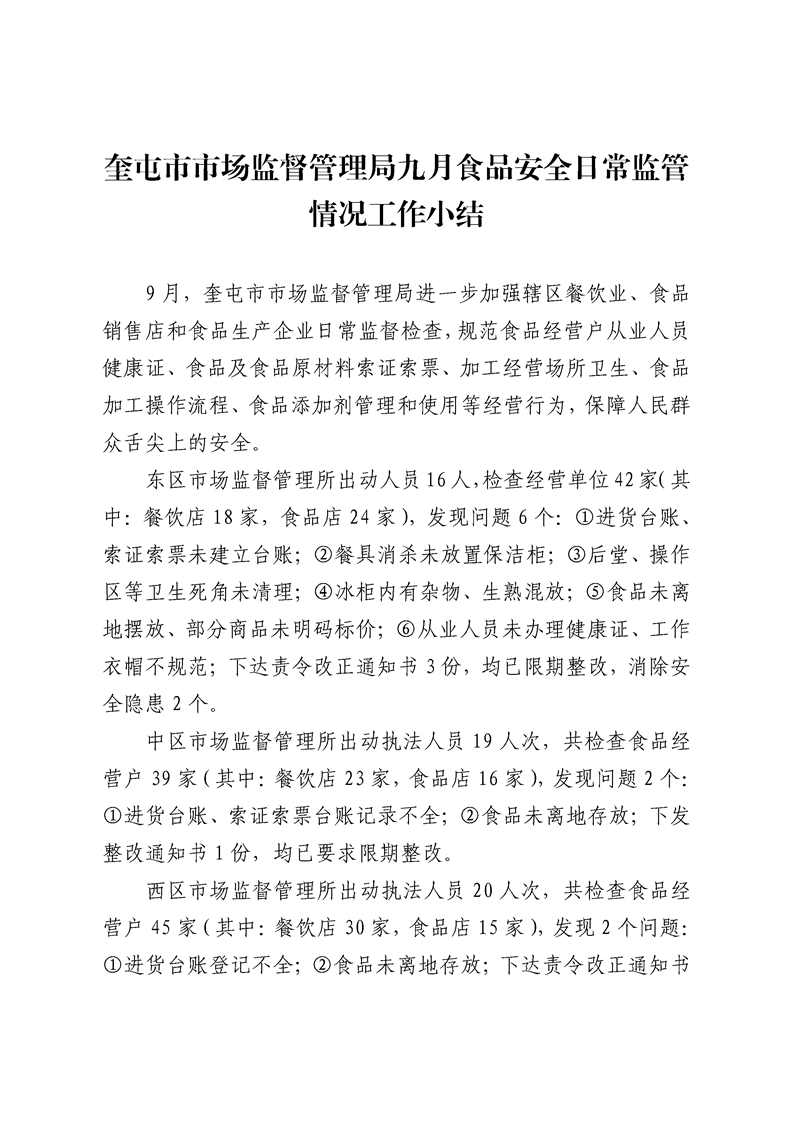 奎屯市市场监督管理局九月食品安全日常监管情况工作小结