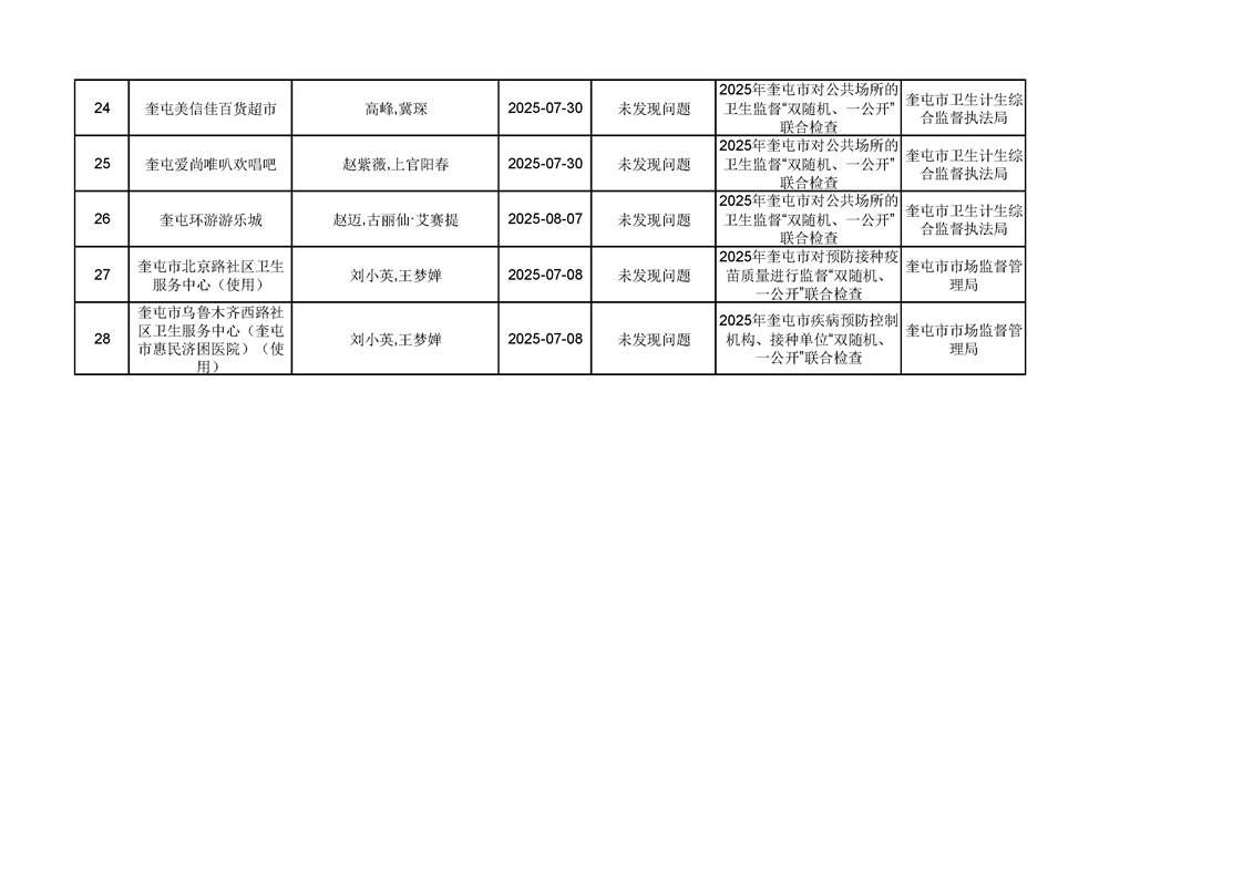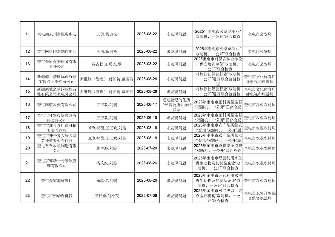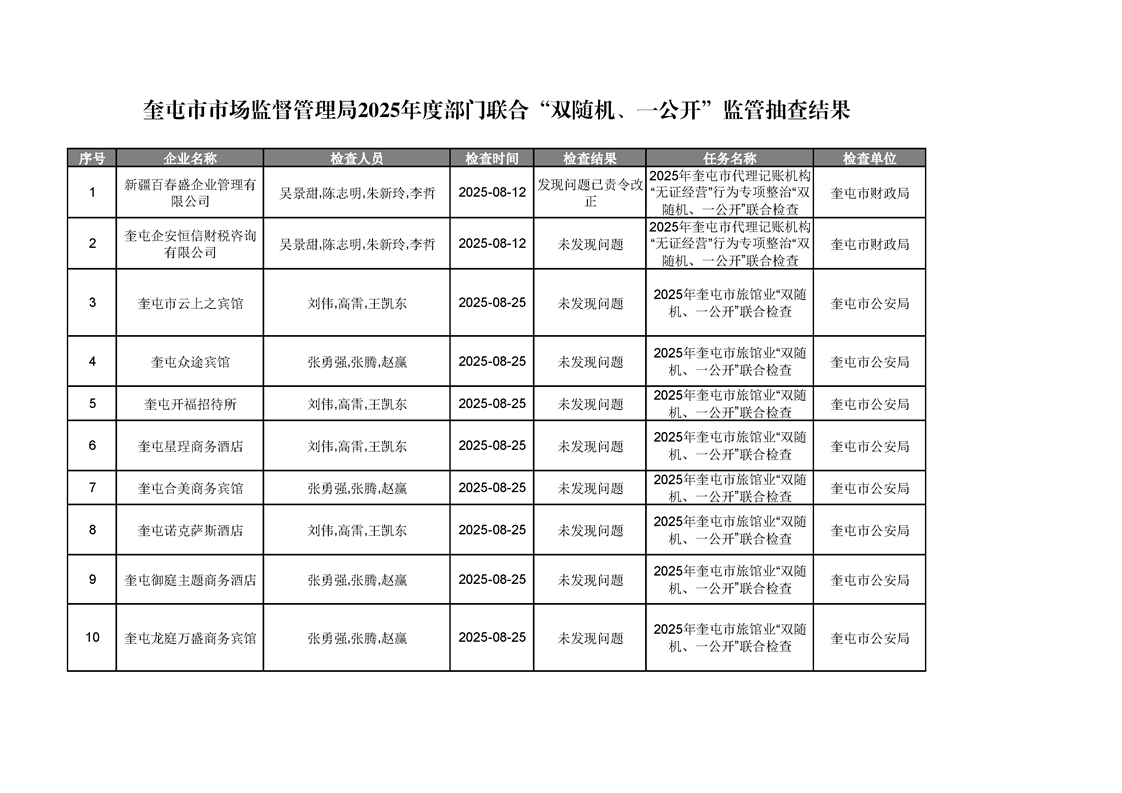 奎屯市市场监督管理局2025年度部门联合“双随机、一公开”监管抽查结果