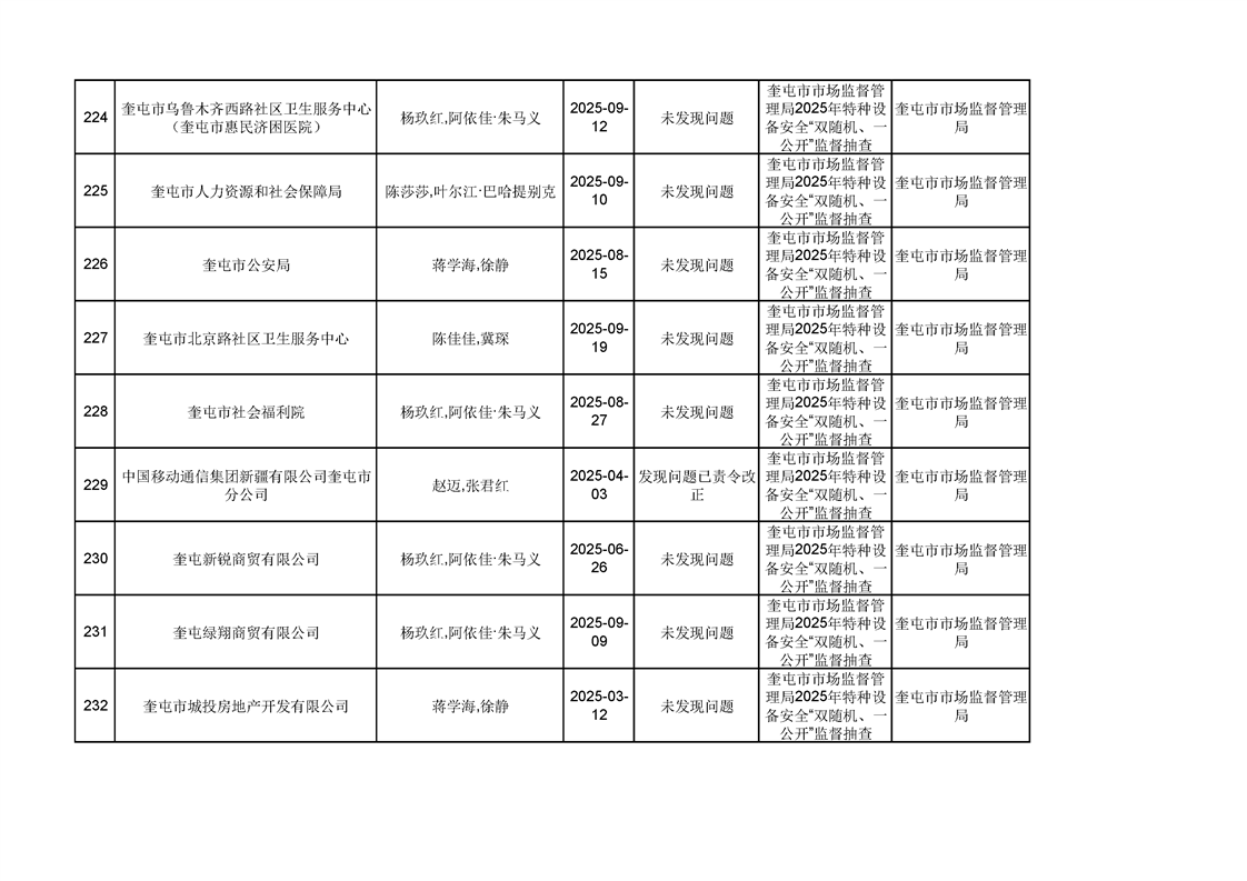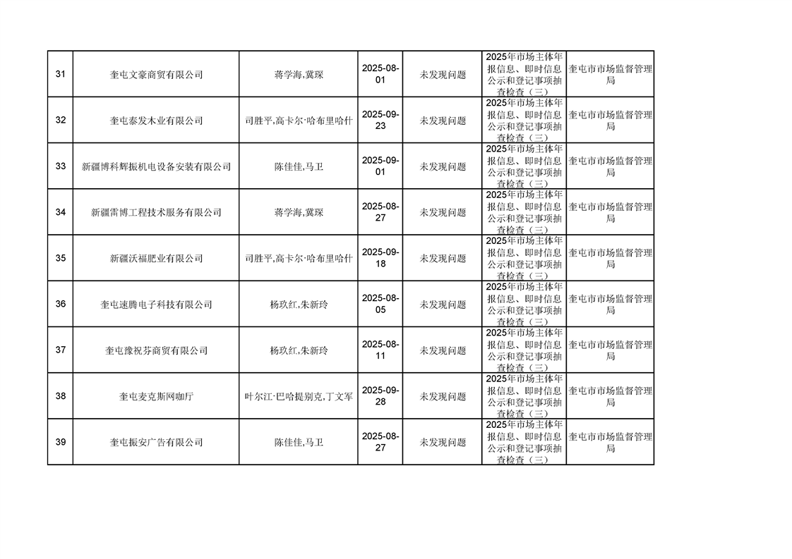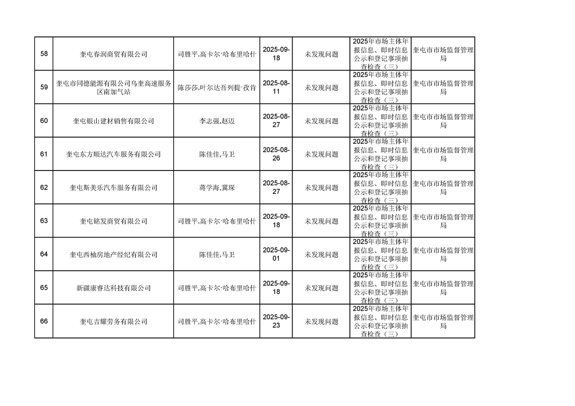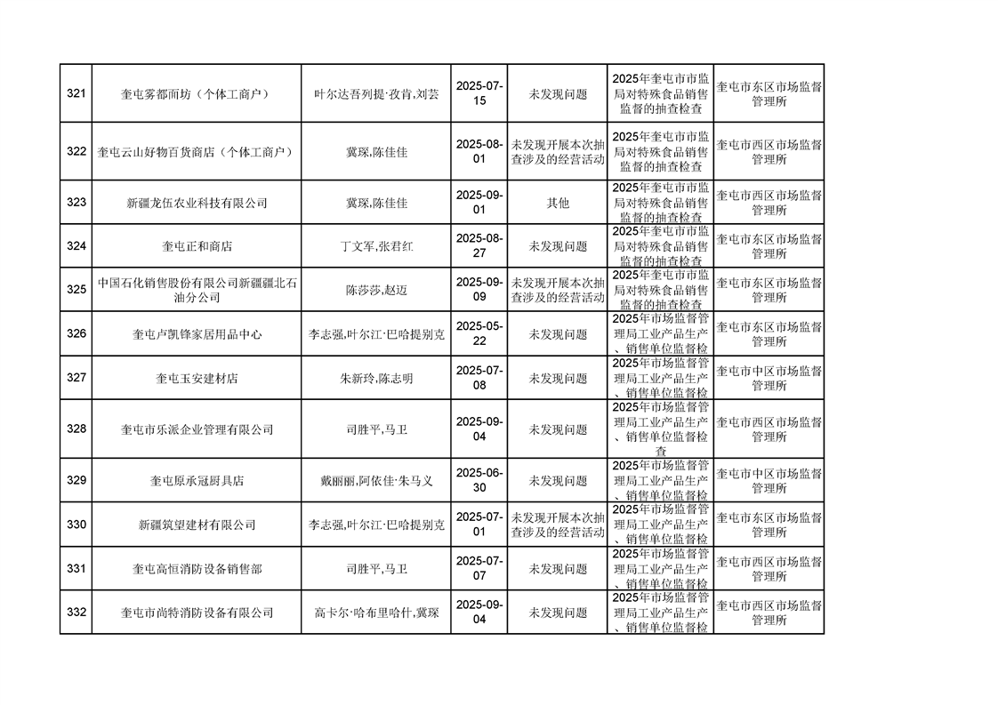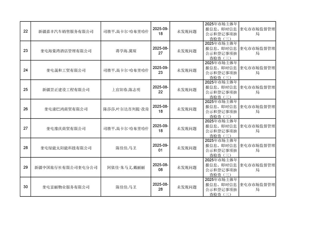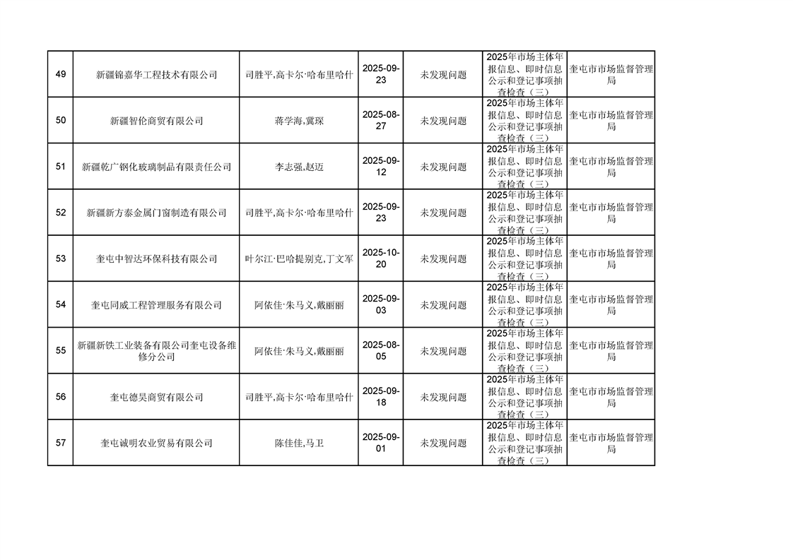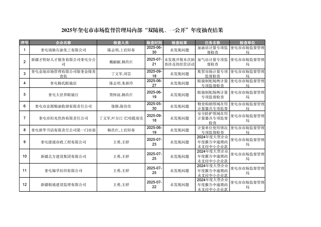 2025年奎屯市市场监督管理局内部“双随机、一公开”年度抽查结果