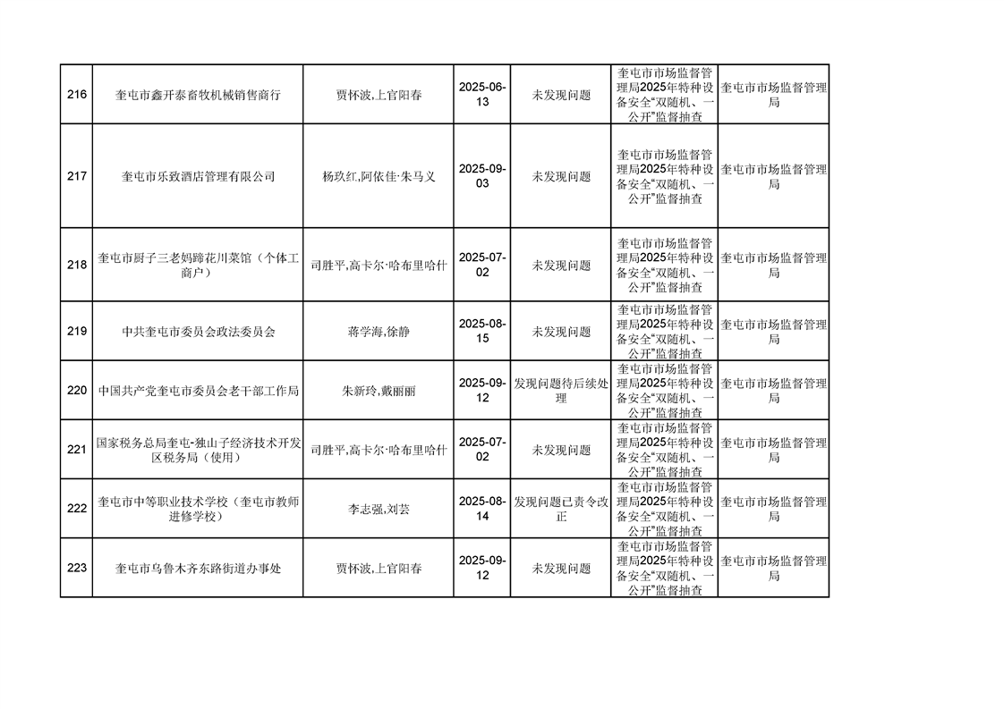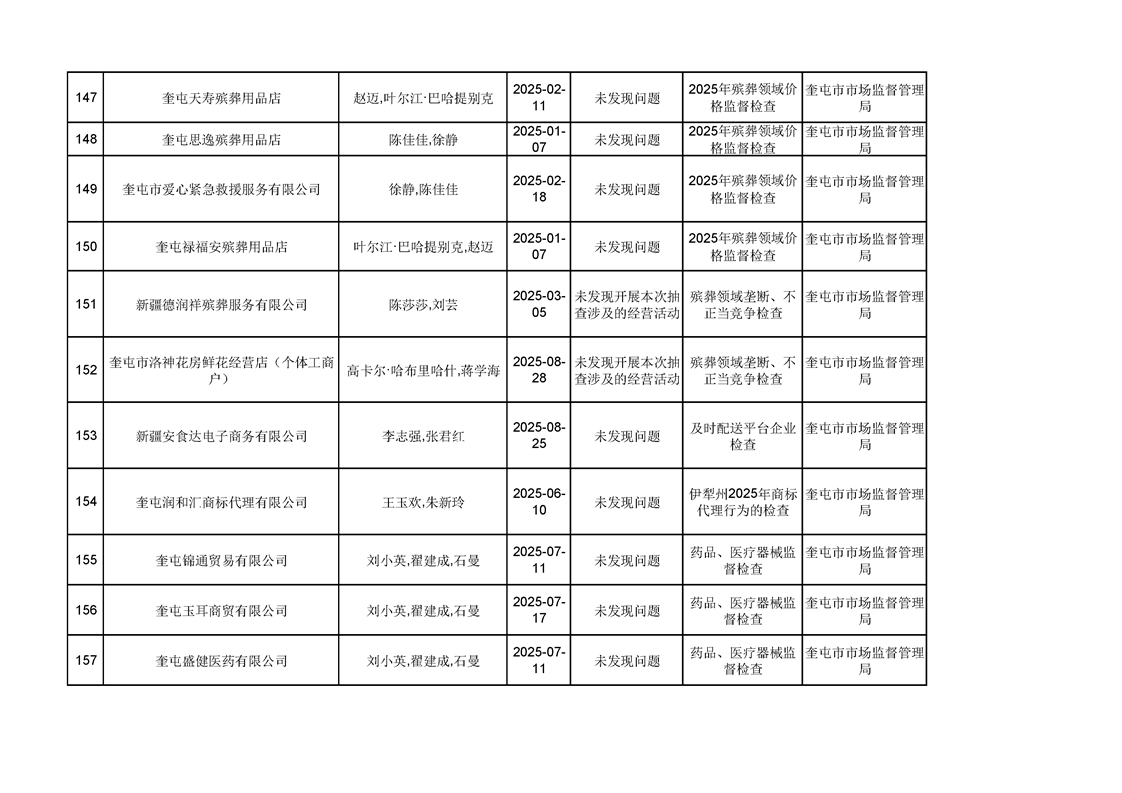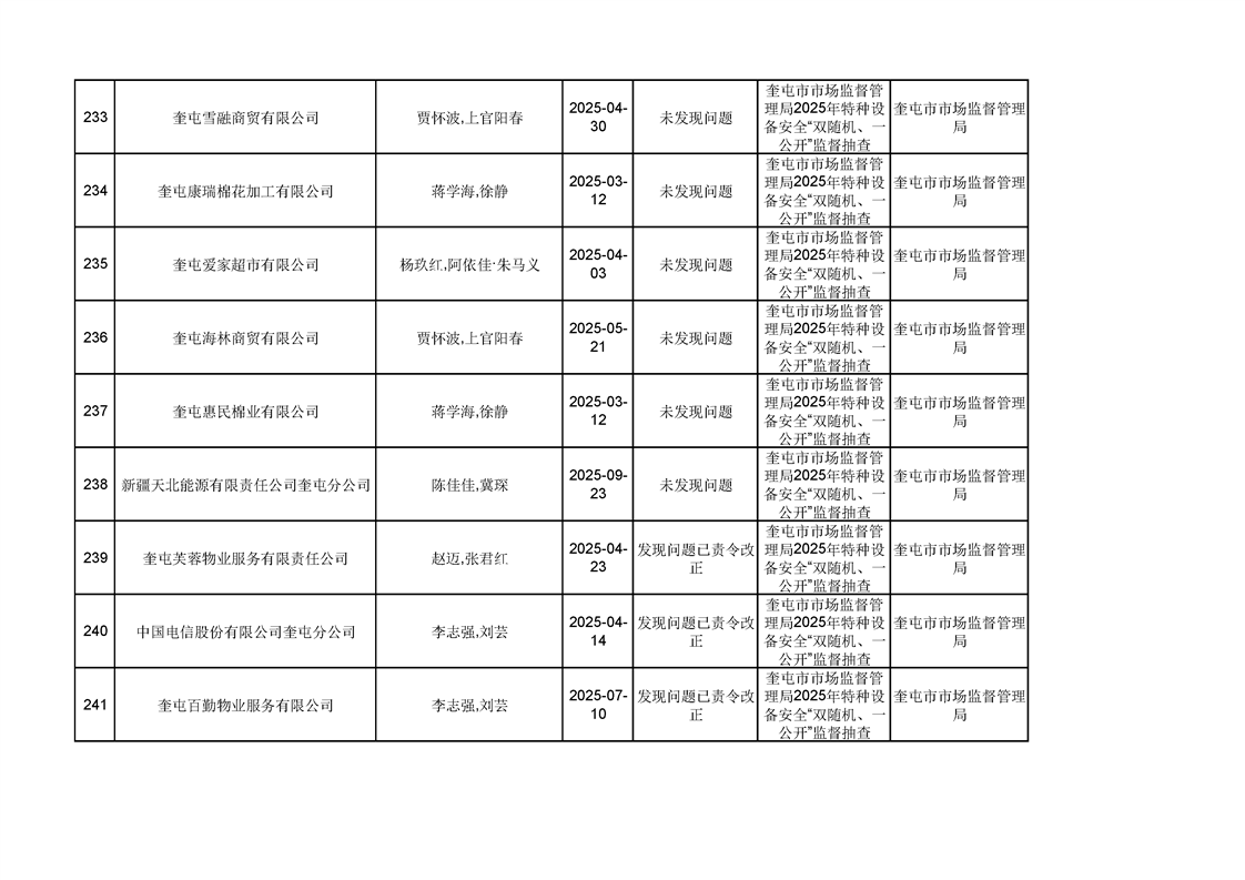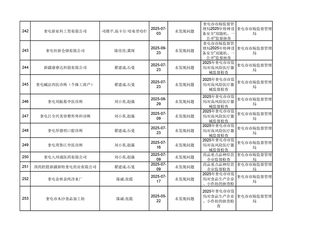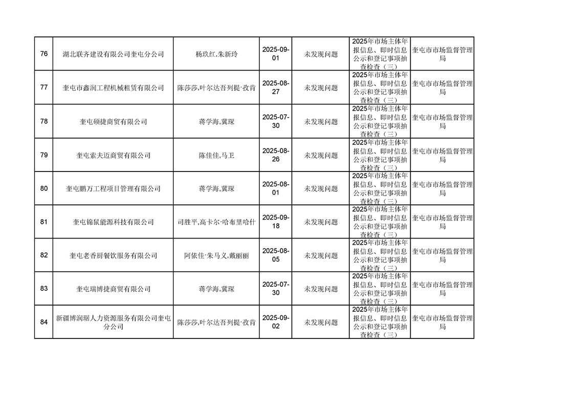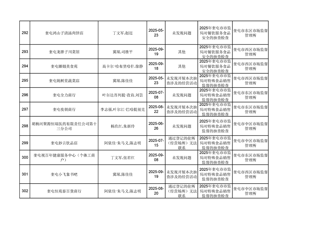 2025年奎屯市市场监督管理局内部“双随机、一公开”年度抽查结果