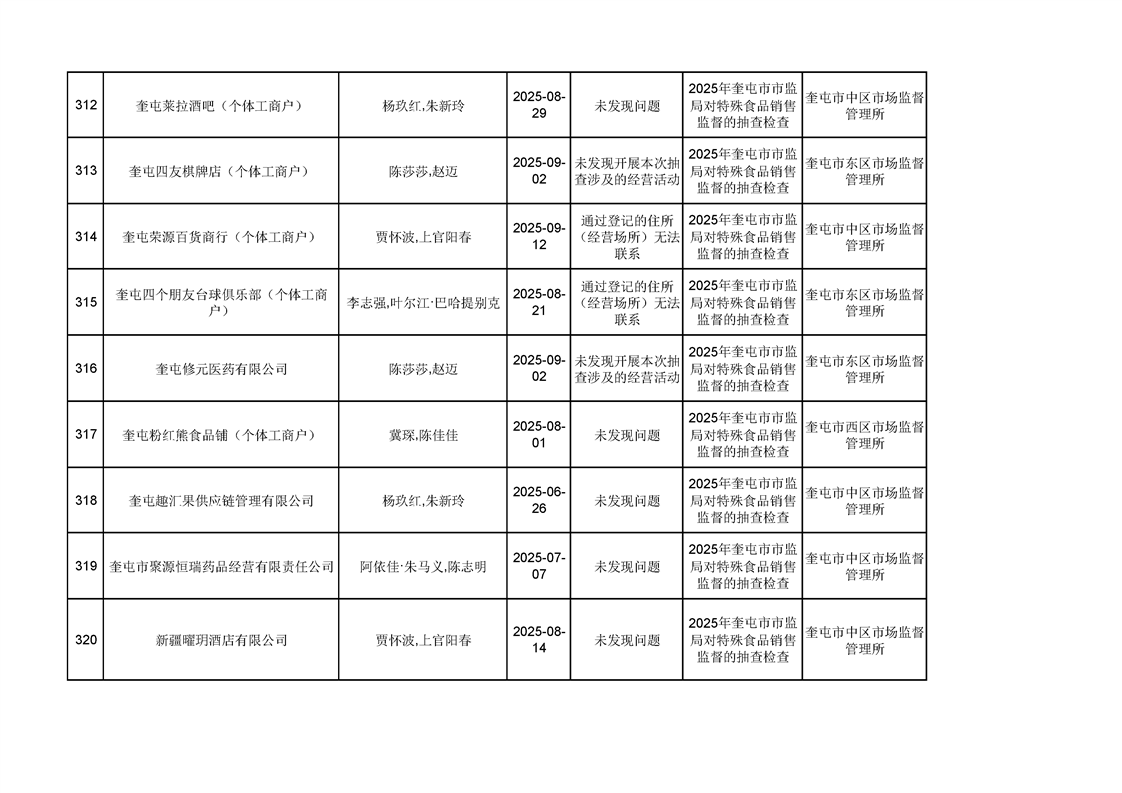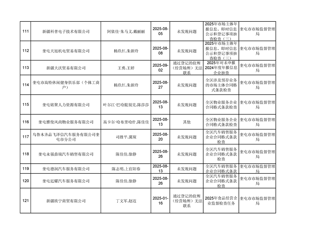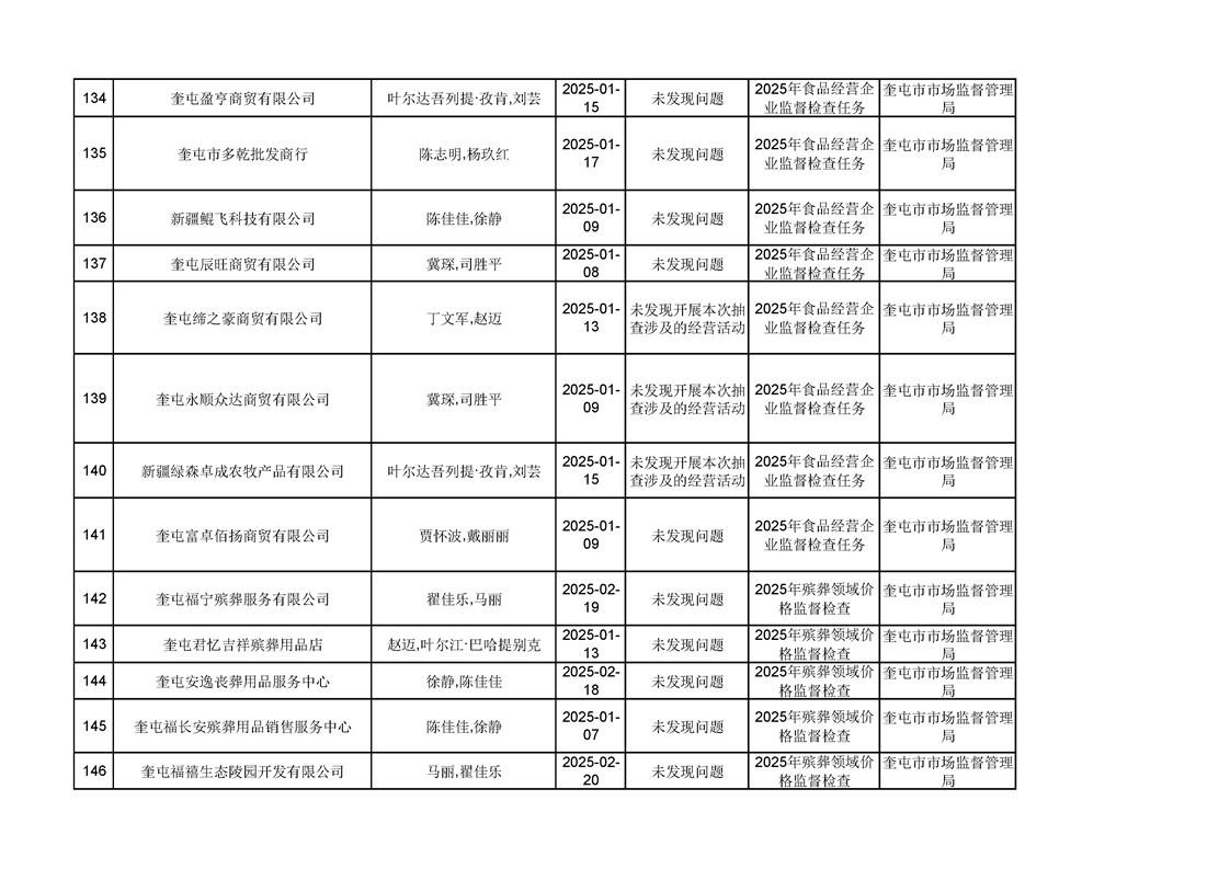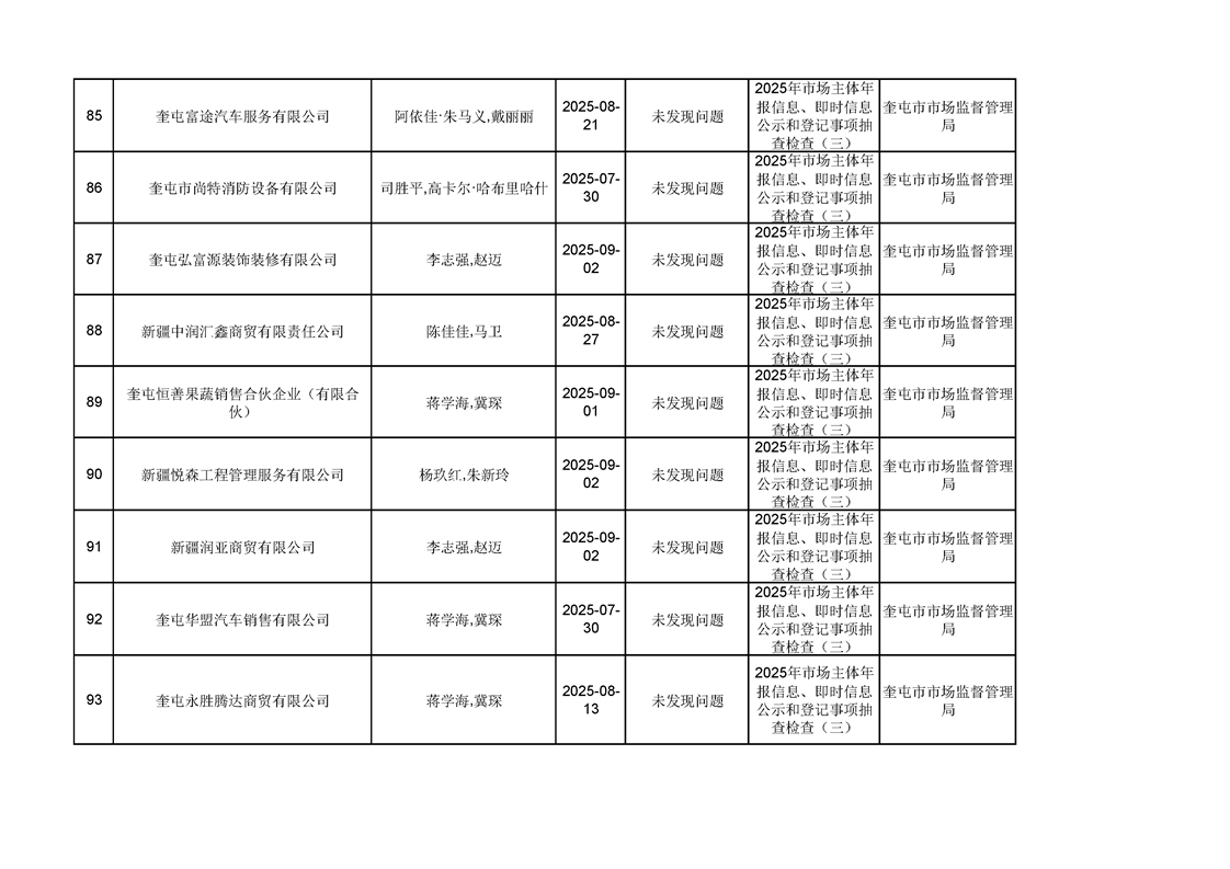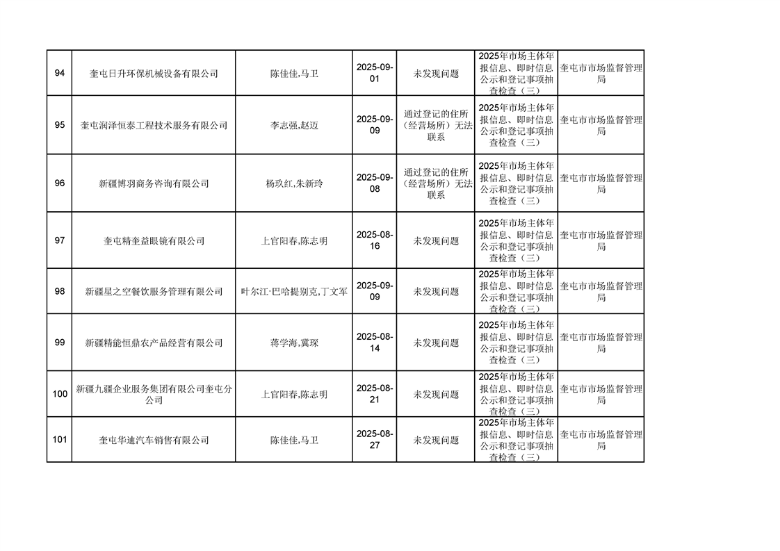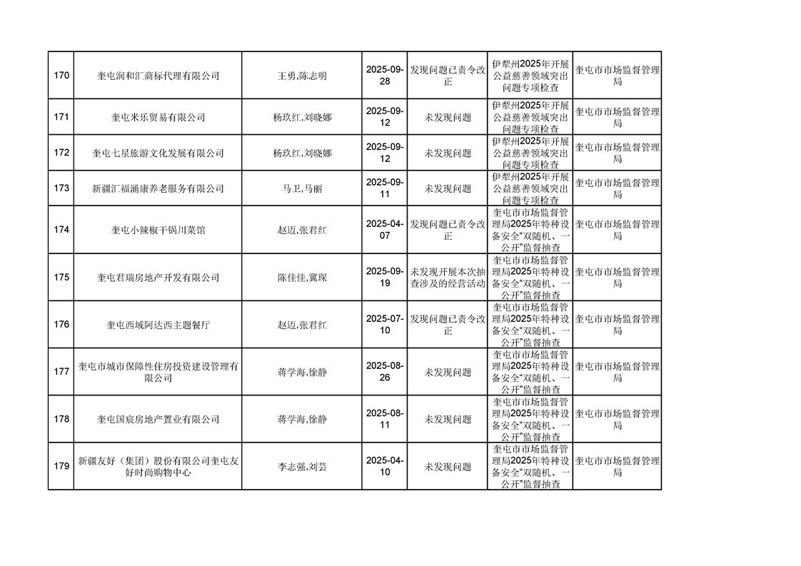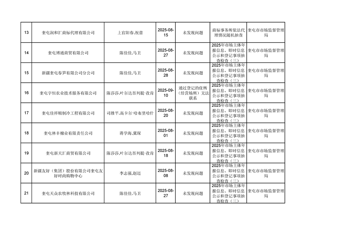 2025年奎屯市市场监督管理局内部“双随机、一公开”年度抽查结果
