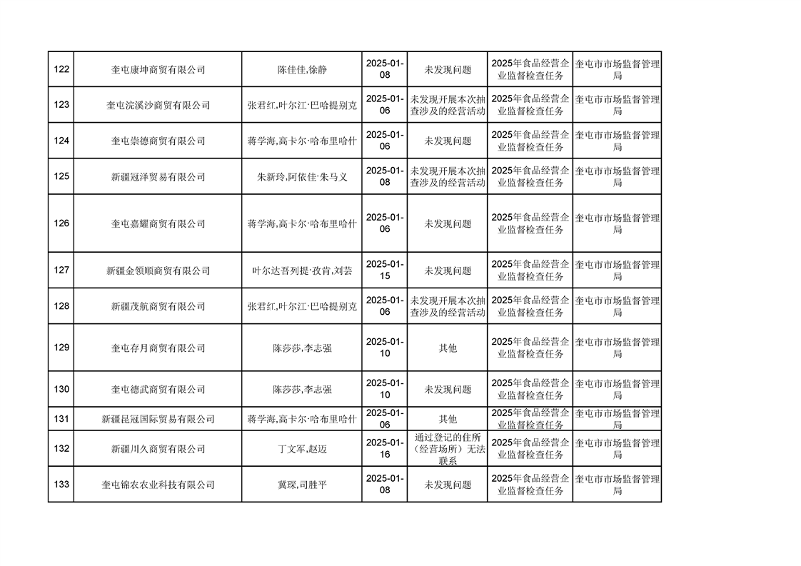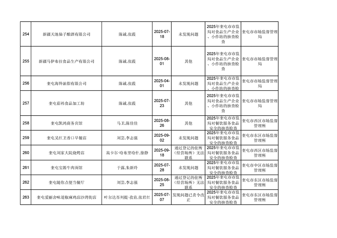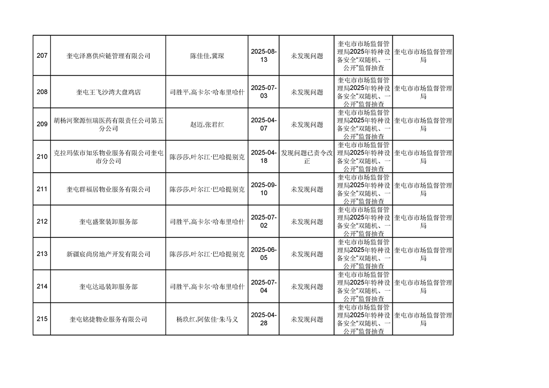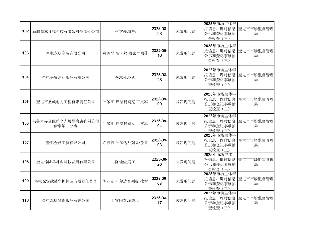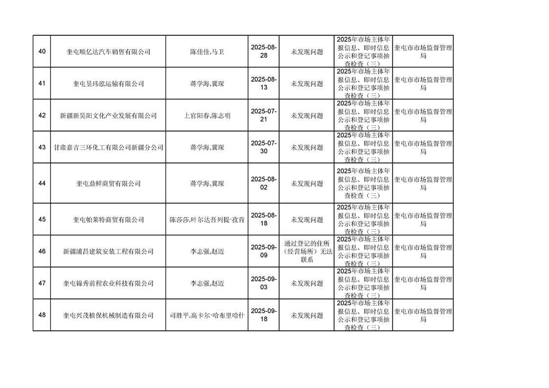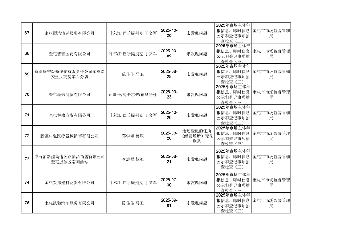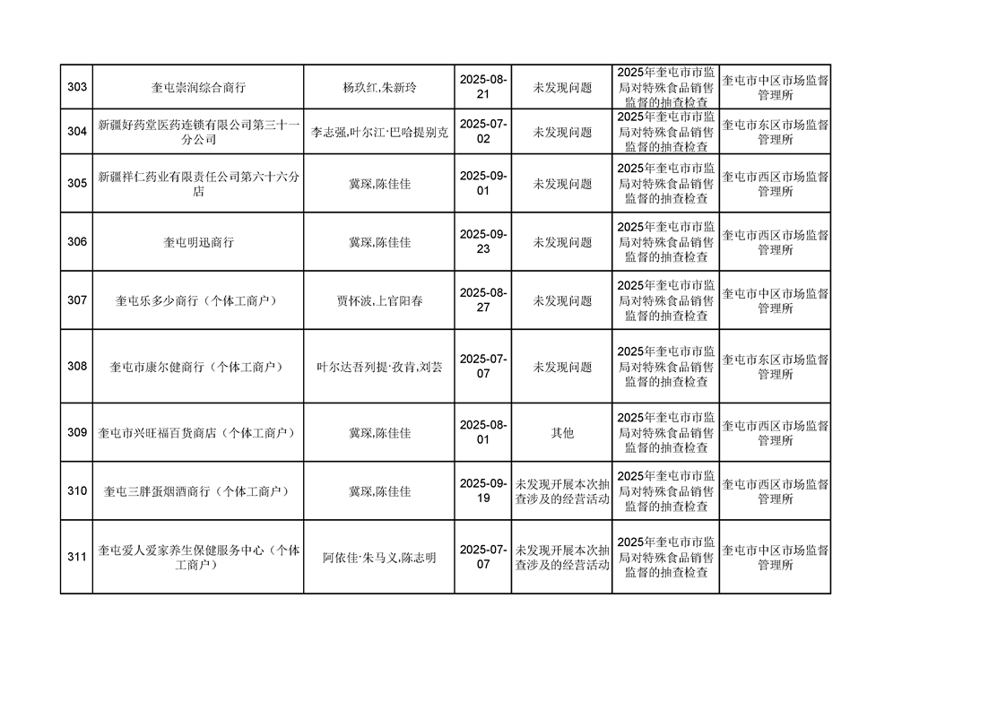 2025年奎屯市市场监督管理局内部“双随机、一公开”年度抽查结果