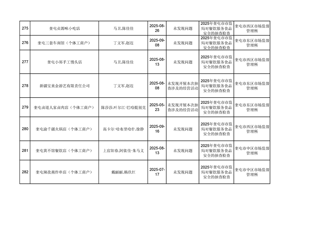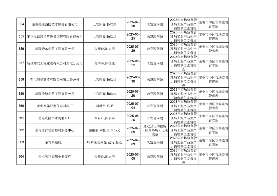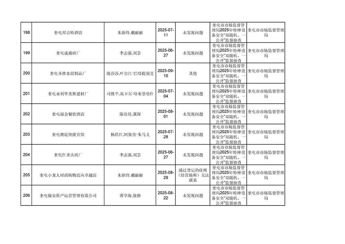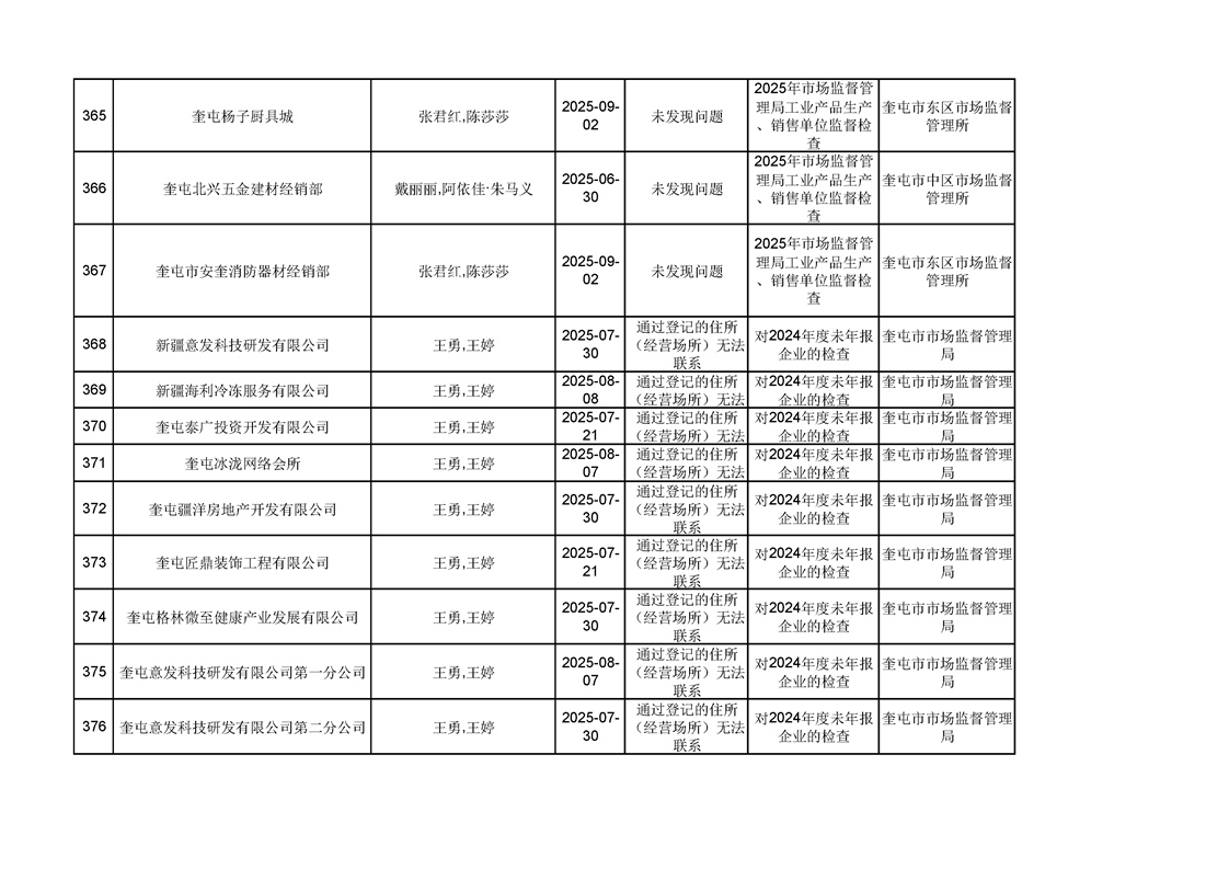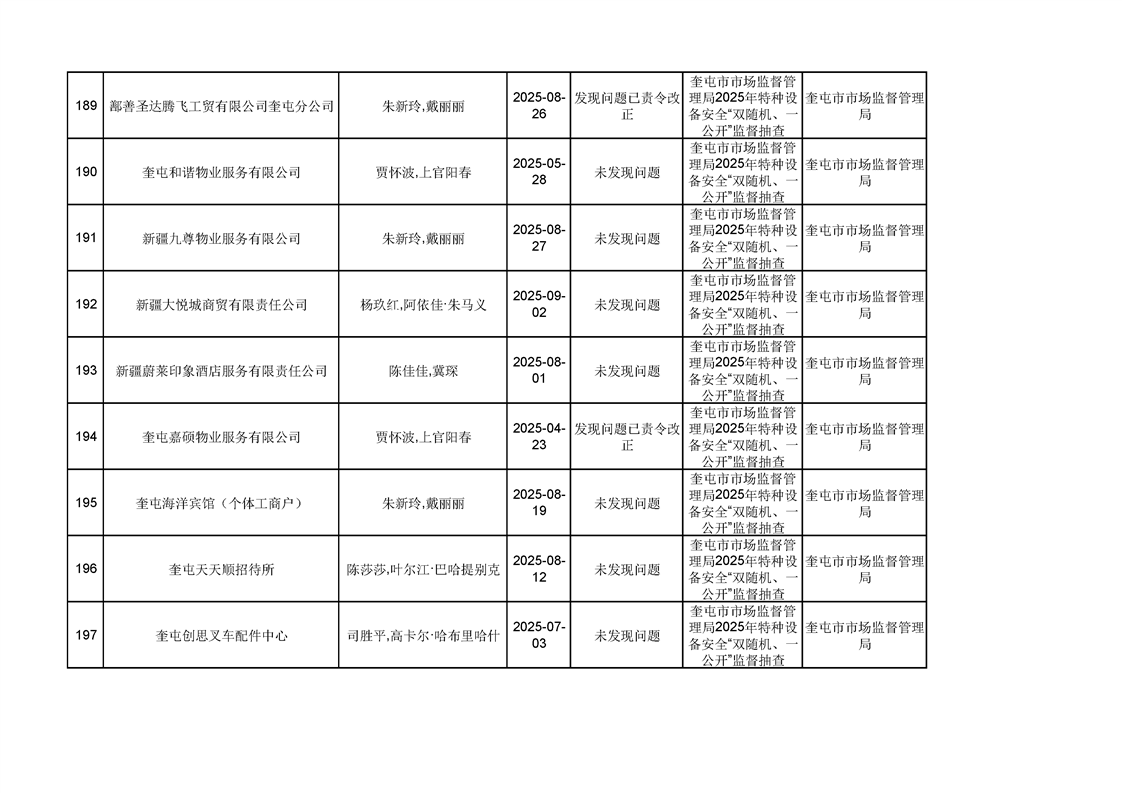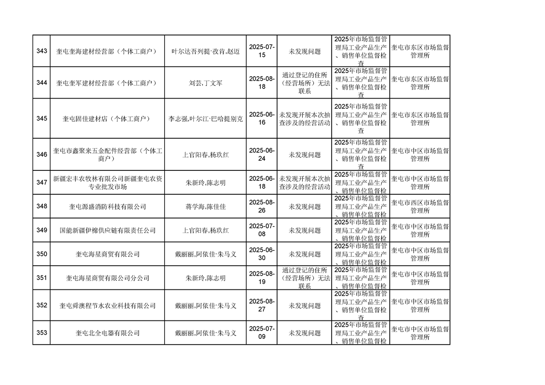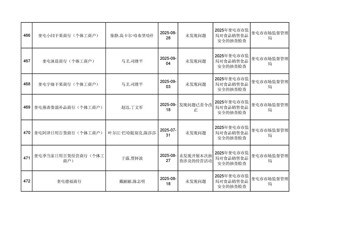 2025年奎屯市市场监督管理局内部“双随机、一公开”年度抽查结果