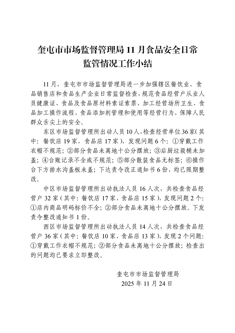 奎屯市市场监督管理局11月食品安全日常监管情况工作小结