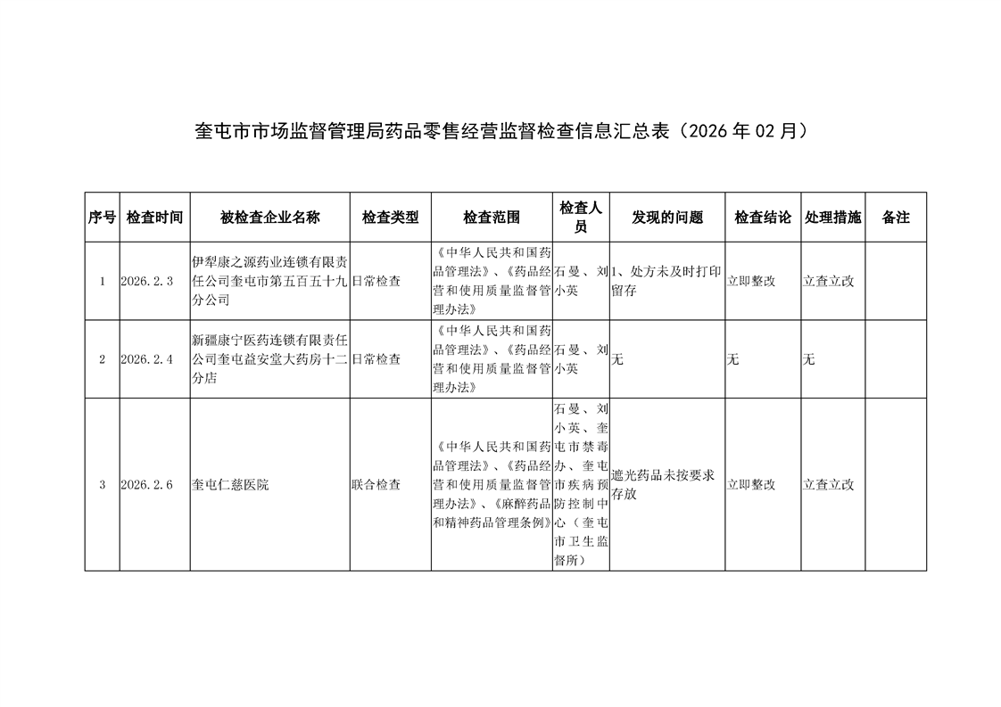 奎屯市市场监督管理局药品零售经营监督检查信息汇总表(2026年02月)