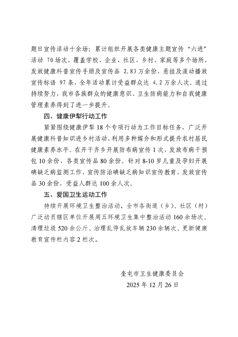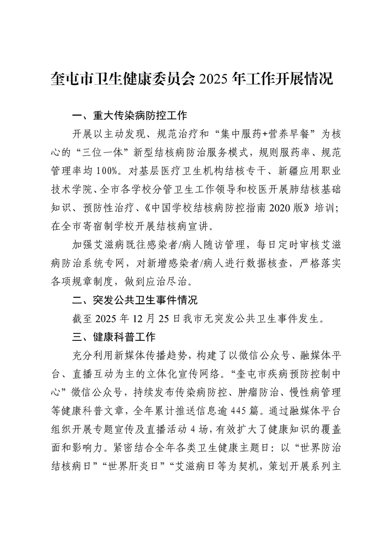 奎屯市卫生健康委员会2025年工作开展情况