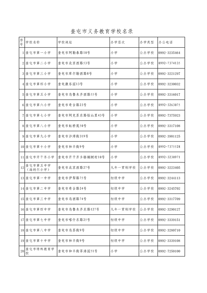 奎屯市义务教育学校名录