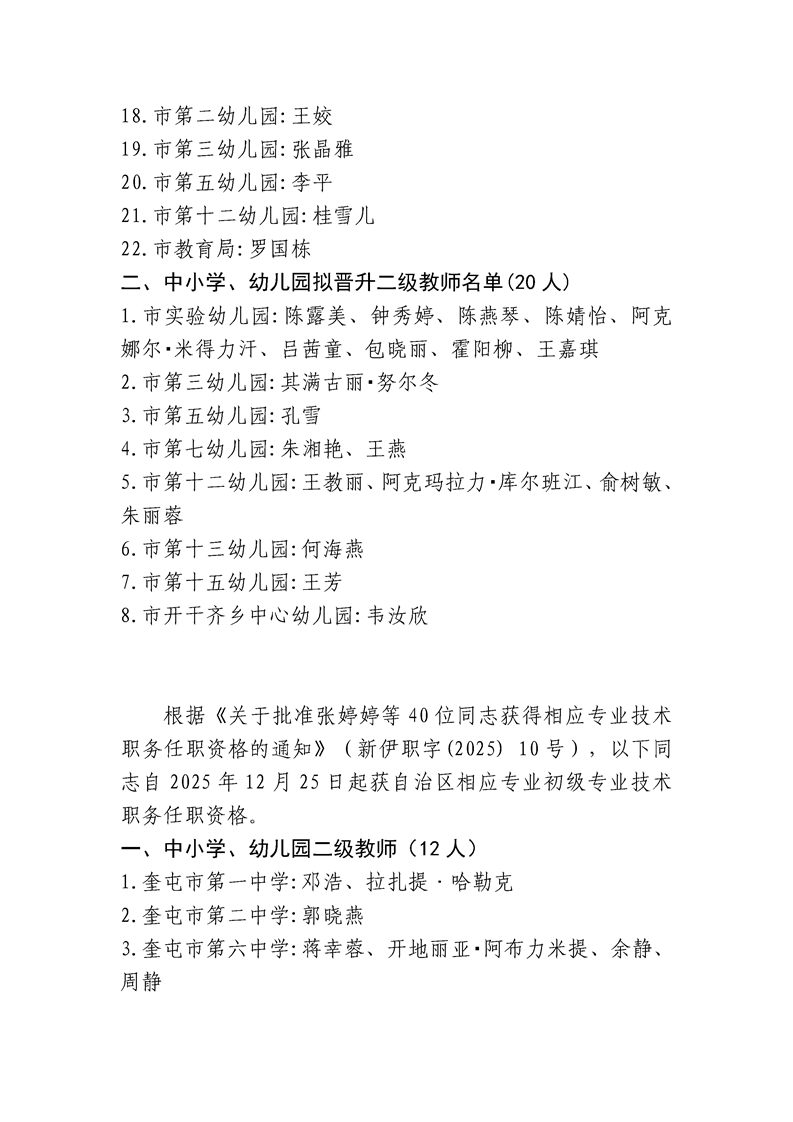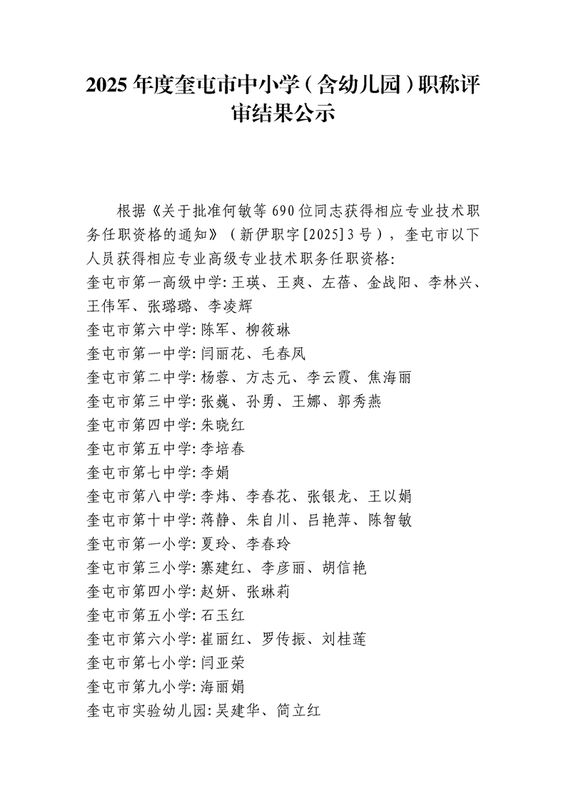 2025年度奎屯市中小学(含幼儿园)职称评审结果公示