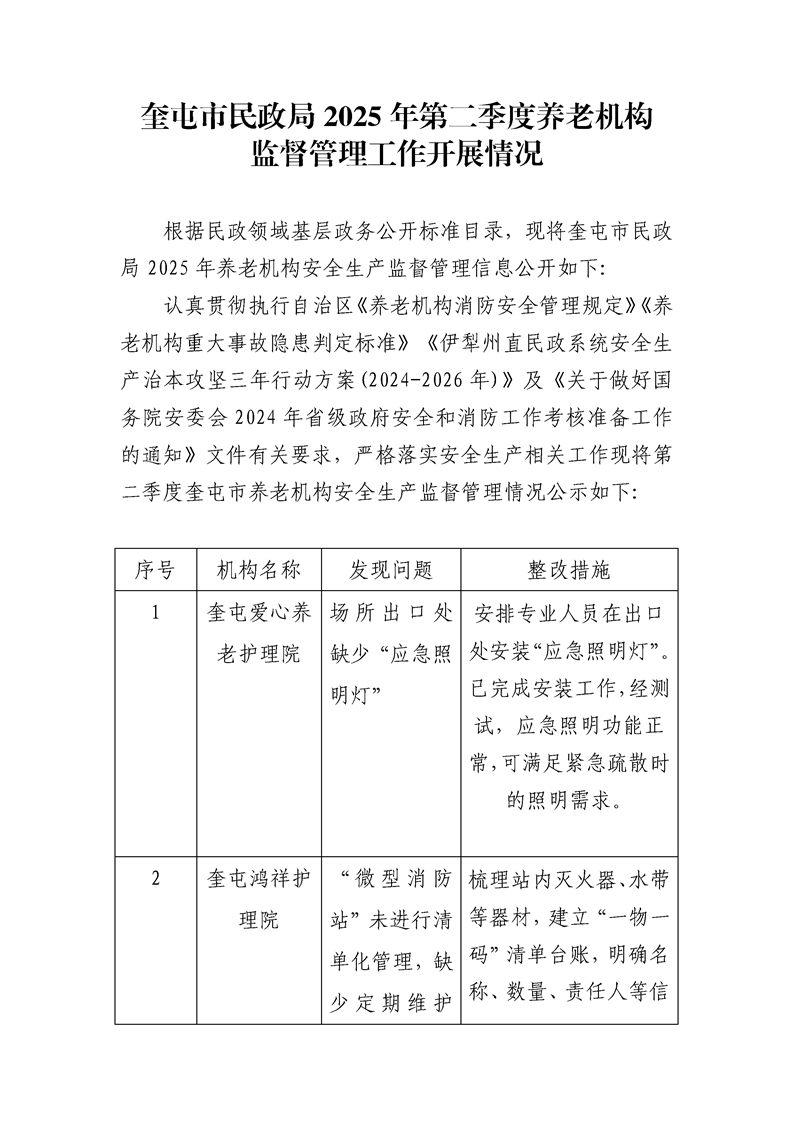 奎屯市民政局2025年第二季度养老机构监督管理工作开展情况