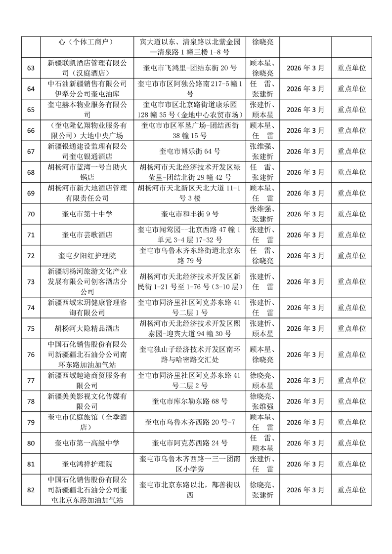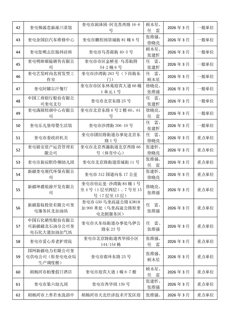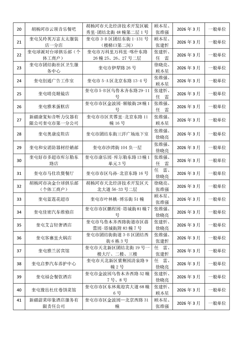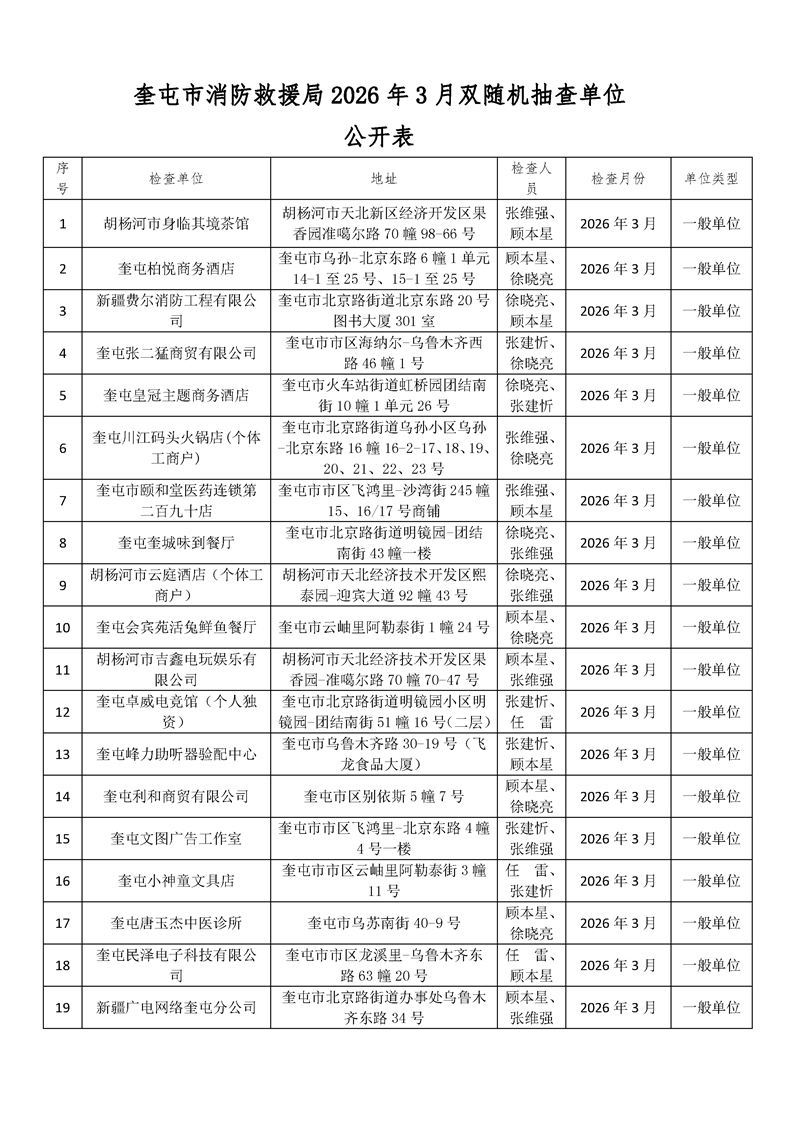 奎屯市消防救援局2026年3月双随机抽查单位公开表