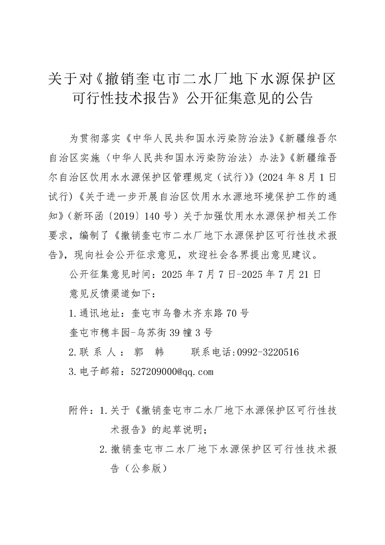 关于对《撤销奎屯市二水厂地下水源保护区可行性技术报告》公开征集意见的公告