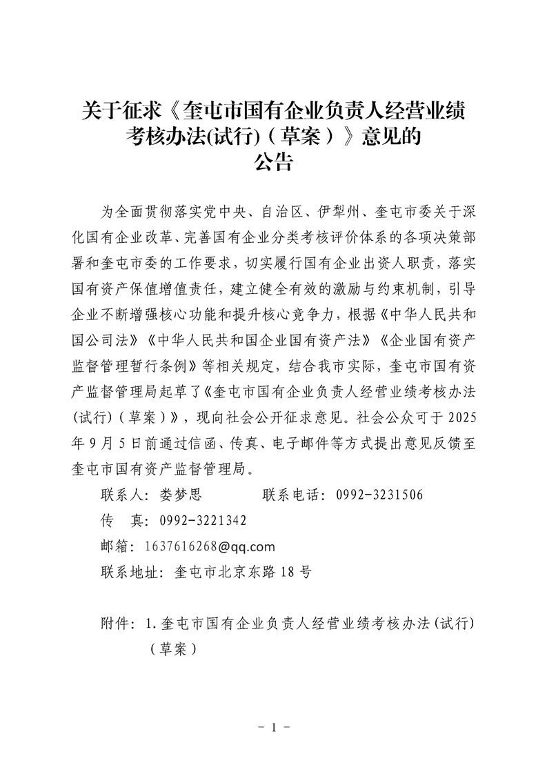 关于征求《奎屯市国有企业负责人经营业绩考核办法(试行)(草案)》意见的公告