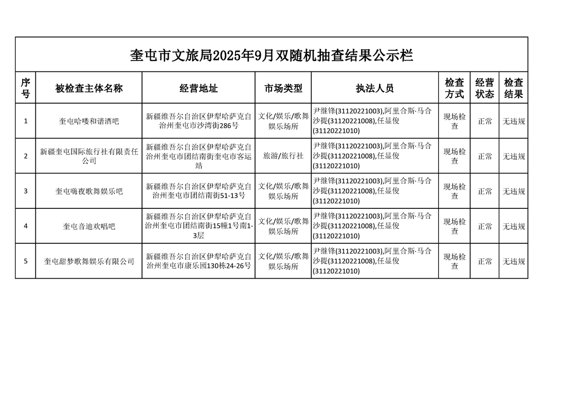 【文化旅游】奎屯市文旅局2025年9月双随机抽查结果公示栏
