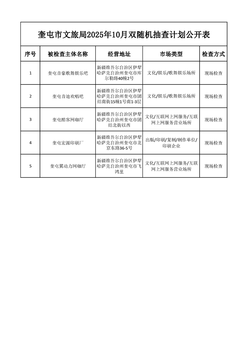 【文化旅游】奎屯市文旅局2025年10月双随机抽查计划公开表