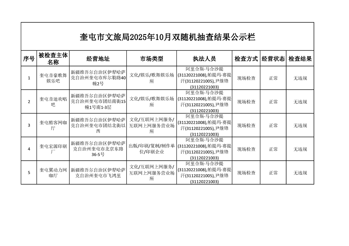 【文化旅游】奎屯市文旅局2025年10月双随机抽查结果公示栏