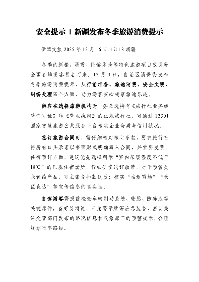 【旅游】安全提示 新疆发布冬季旅游消费提示