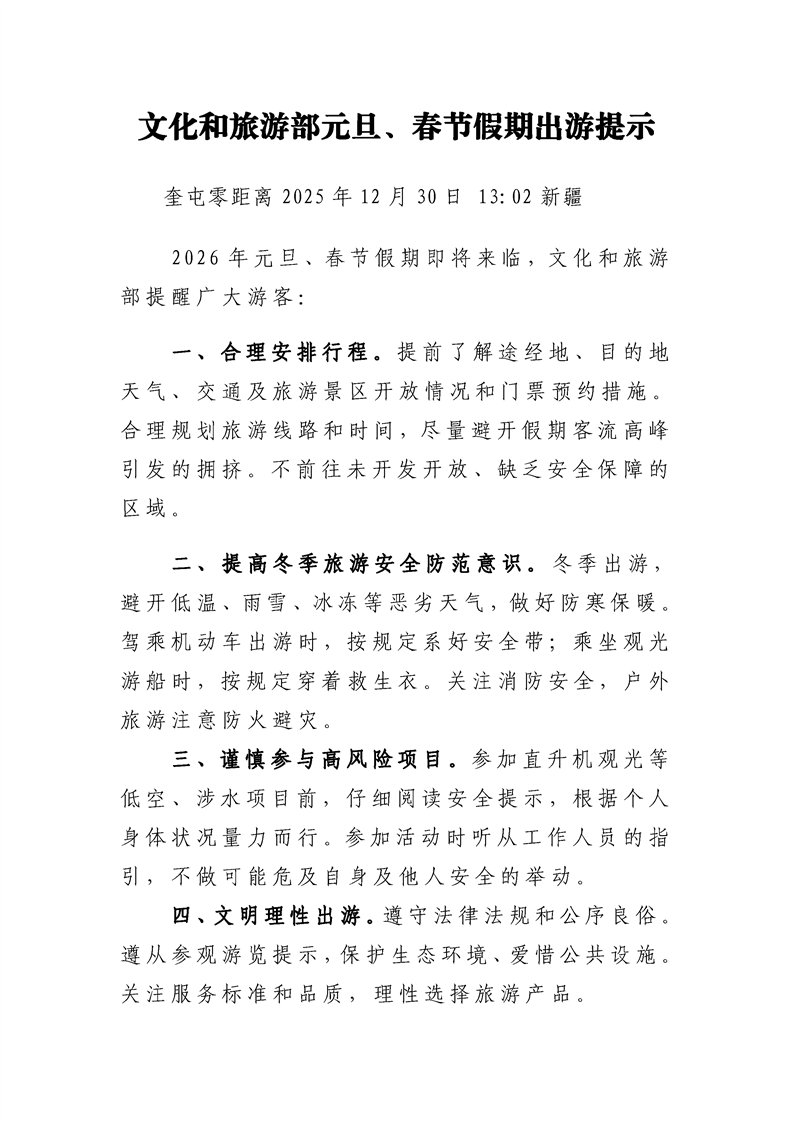 【旅游】文化和旅游部元旦 春节假期出游提示