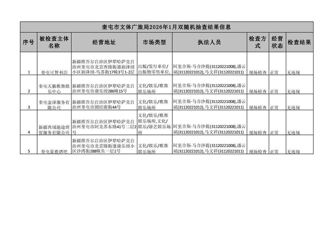 【文化旅游】奎屯市文体广旅局2026年1月双随机抽查结果信息