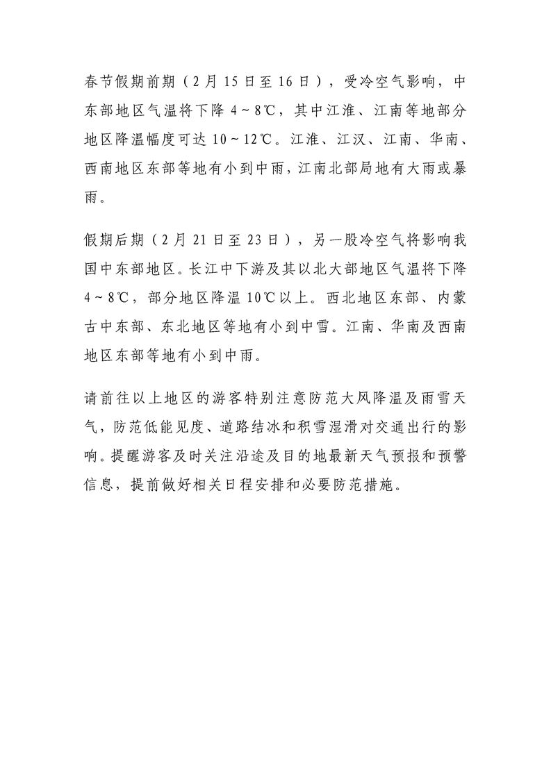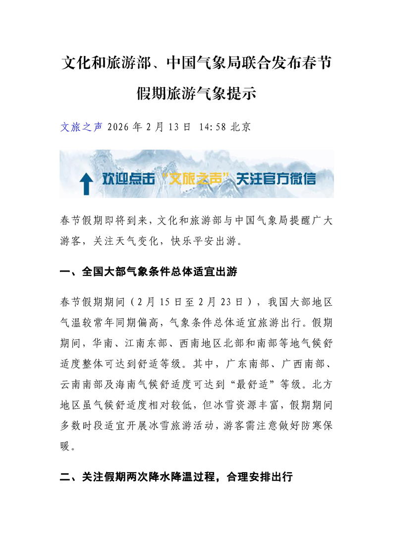 【旅游】文化和旅游部、中国气象局联合发布春节假期旅游气象提示