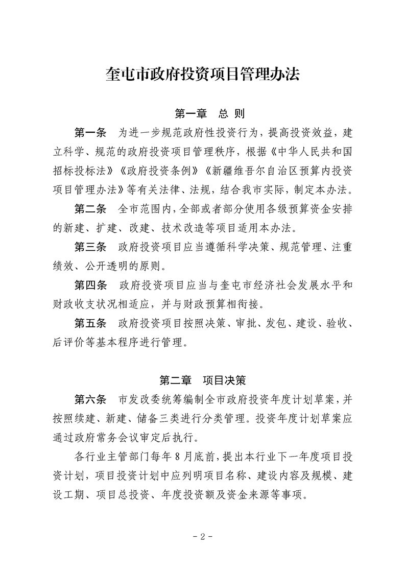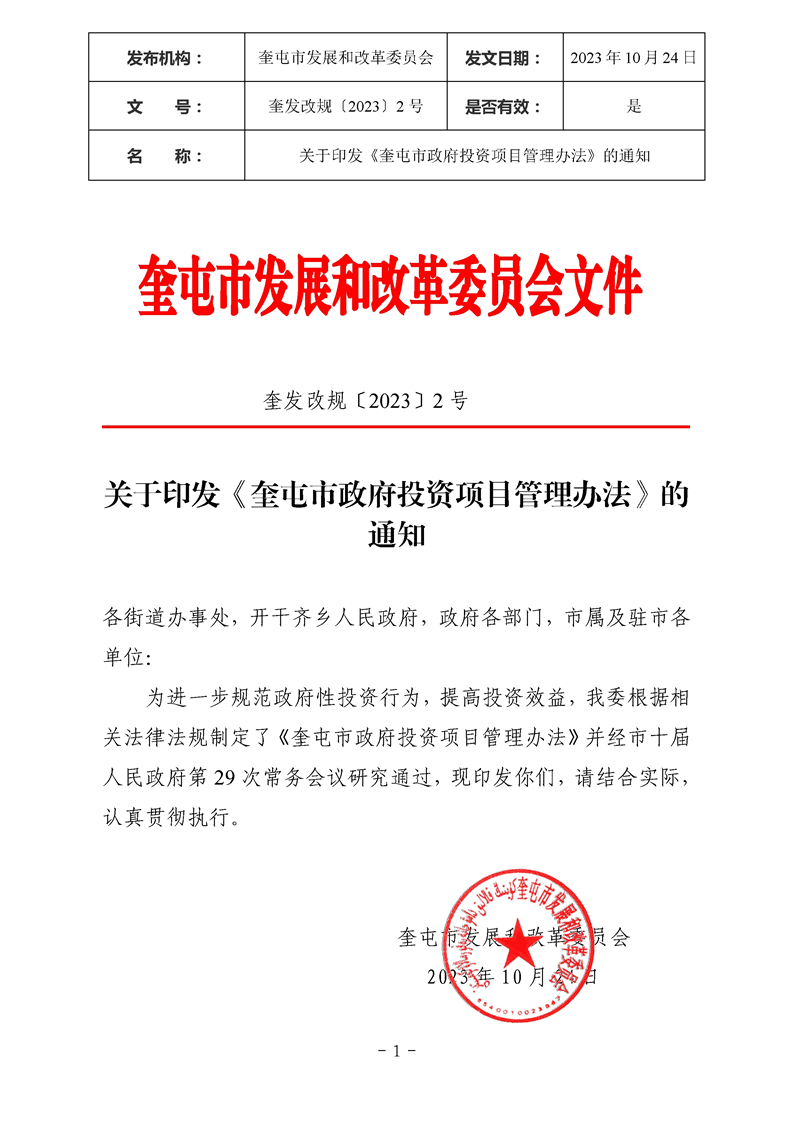【奎发改规﹝2023﹞2号】关于印发《奎屯市政府投资项目管理办法》的通知