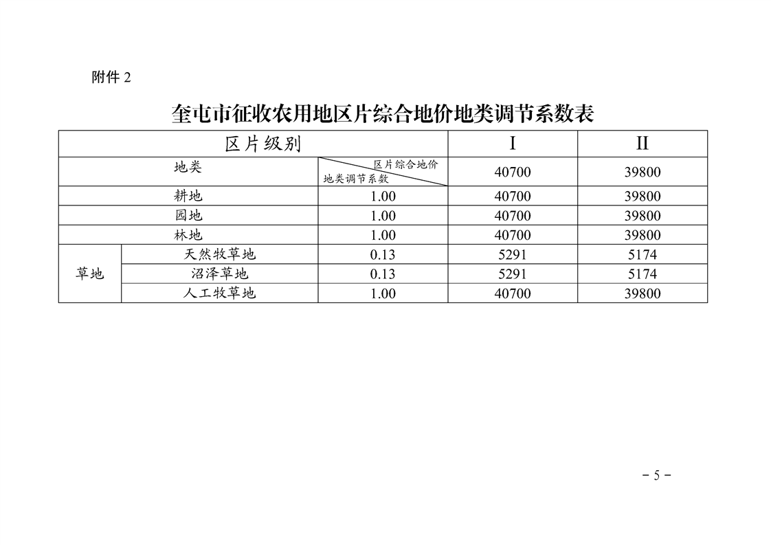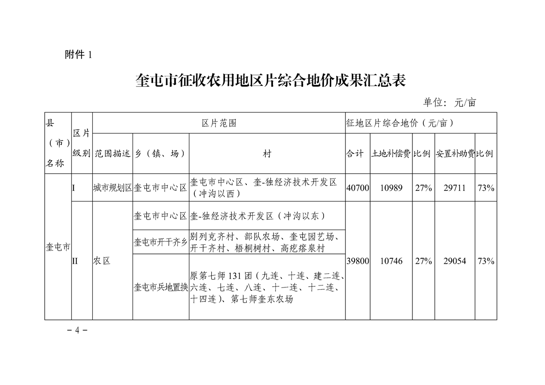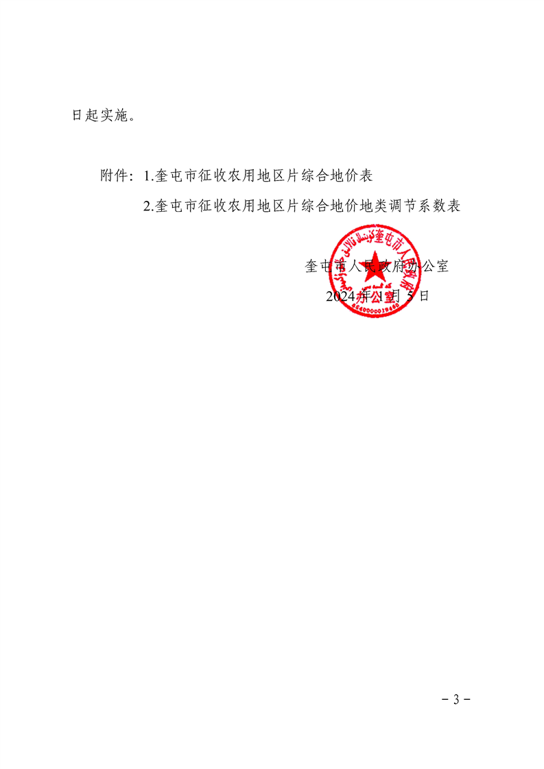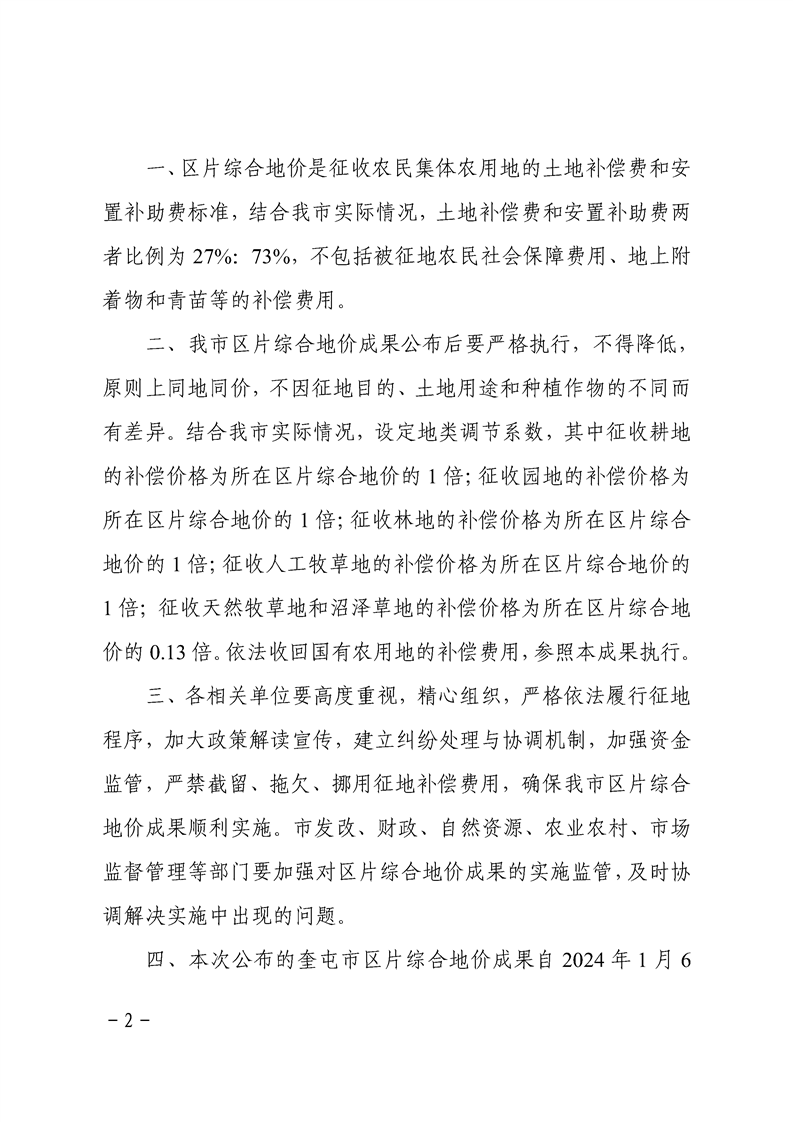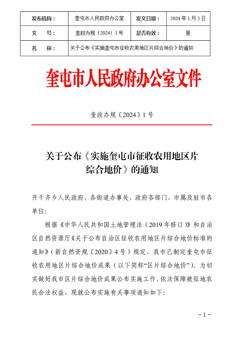 【奎政办规﹝2024﹞1号】关于公布《实施奎屯市征收农用地区片综合地价》的通知