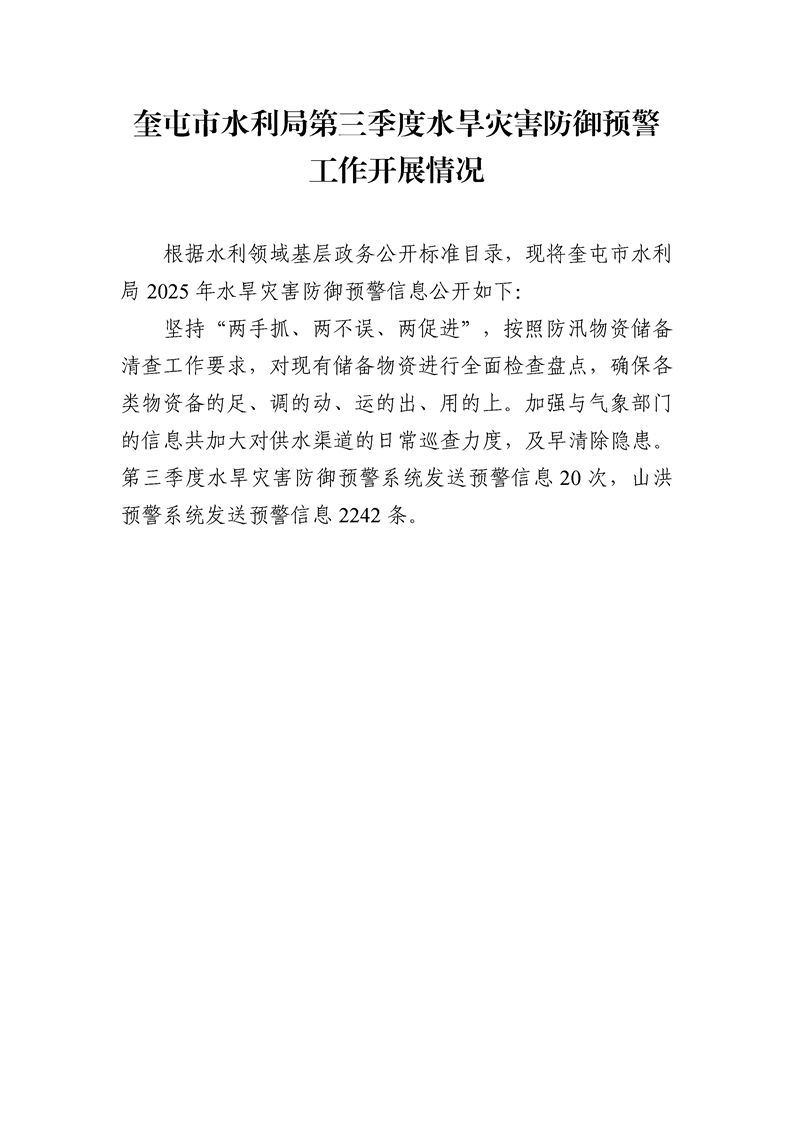 奎屯市水利局第三季度水旱灾害防御预警工作开展情况