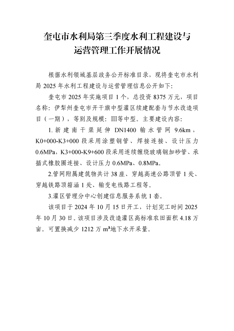 奎屯市水利局第三季度水利工程建设与运营管理工作开展情况