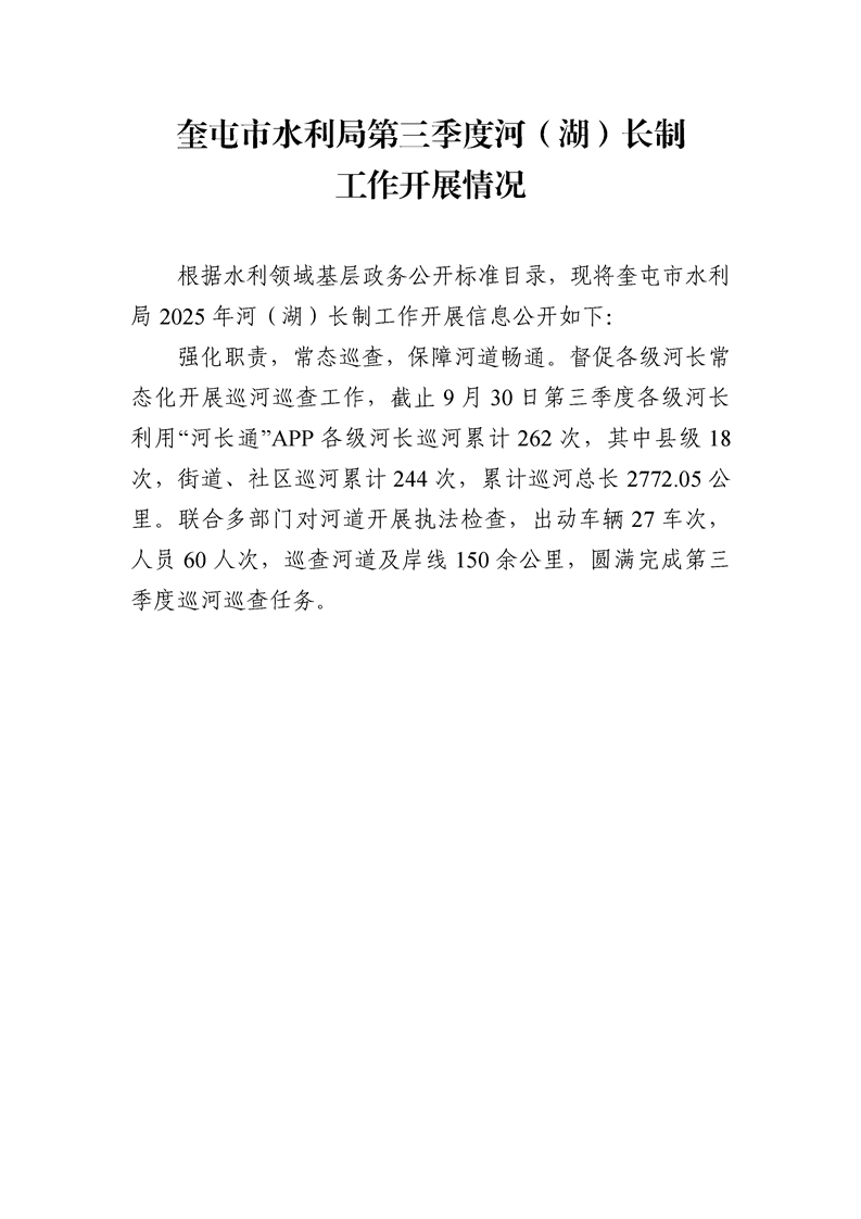 奎屯市水利局第三季度河(湖)长制工作开展情况