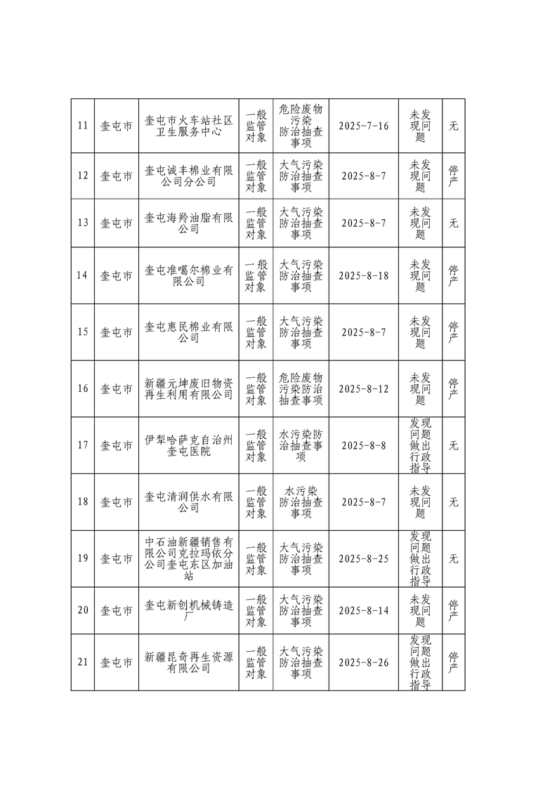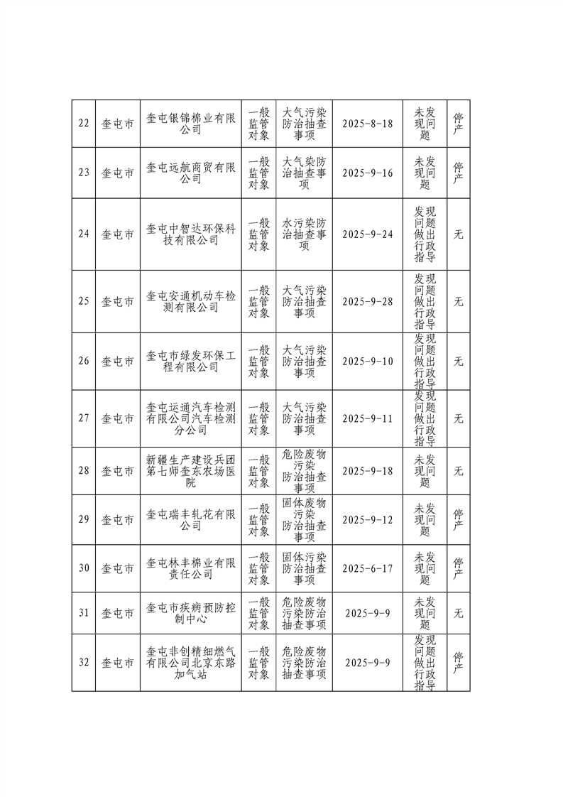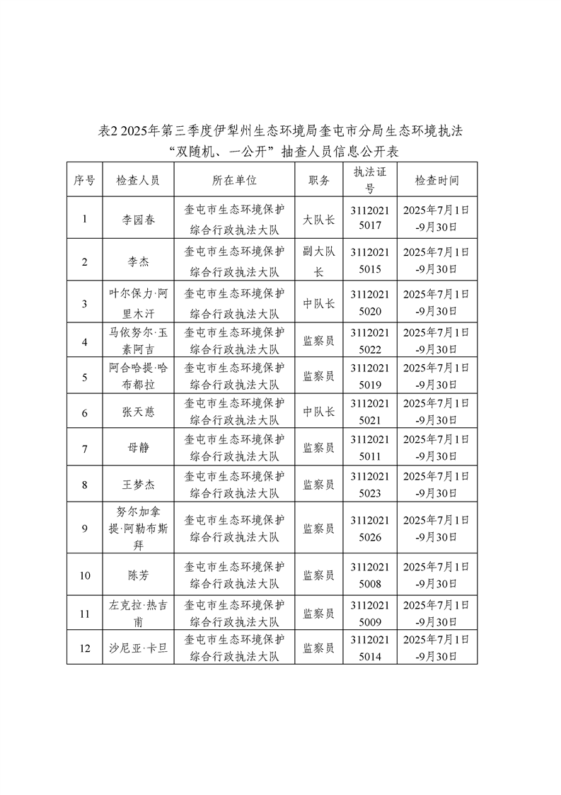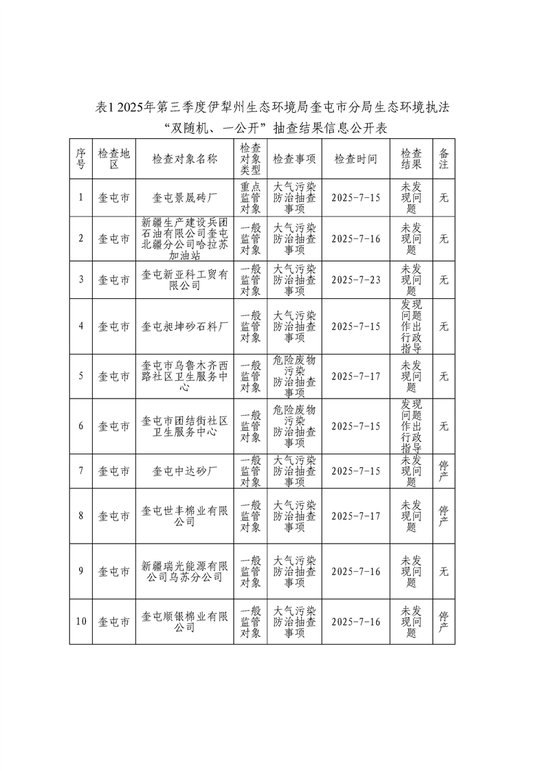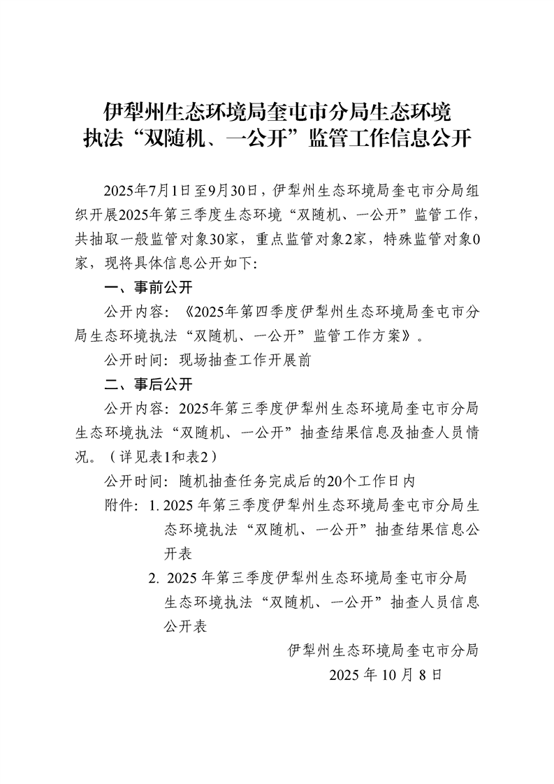 伊犁州生态环境局奎屯市分局生态环境执法“双随机、一公开”监管工作信息公开