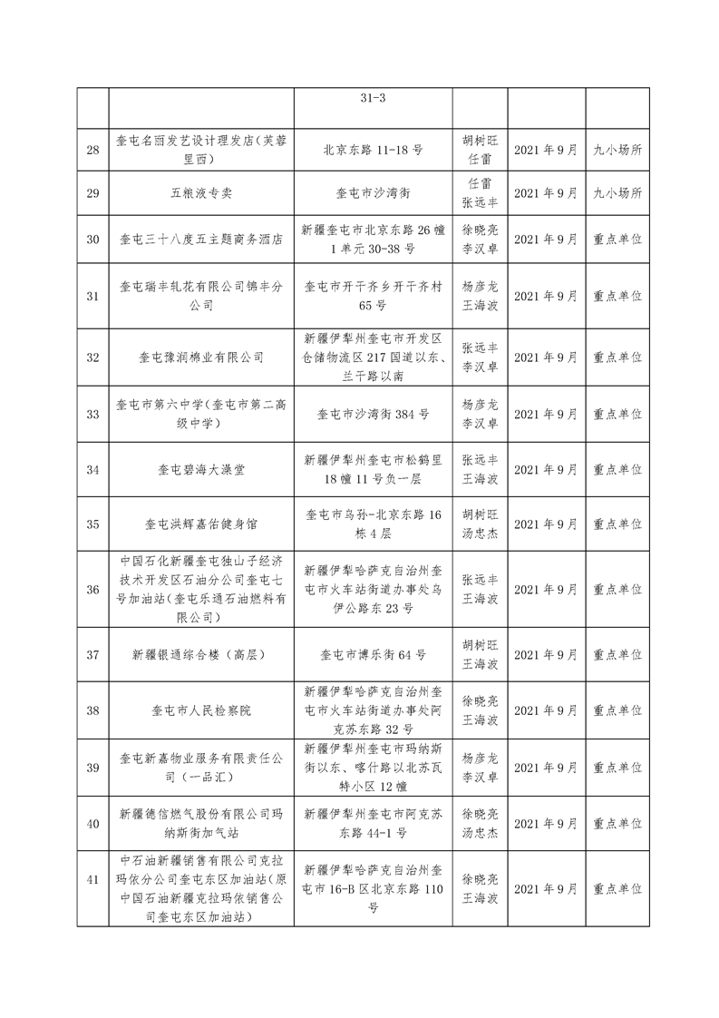 奎屯市消防救援大队2021年9月双随机抽查单位公开表