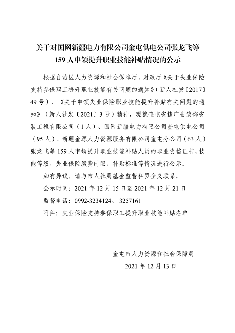 关于对国网新疆电力有限公司奎屯供电公司张龙飞等159人申领提升职业技能补贴情况的公示