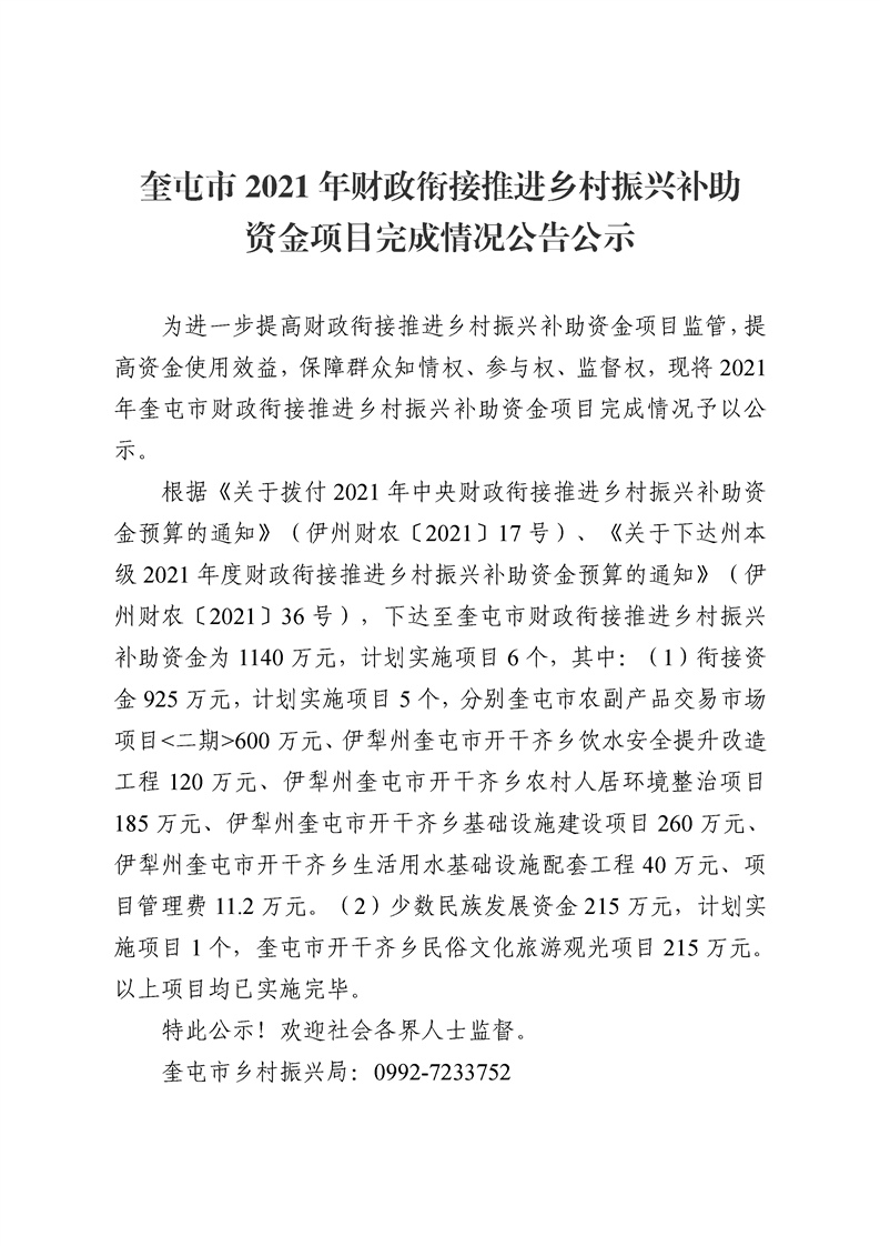奎屯市2021年财政衔接推进乡村振兴补助资金项目完成情况公告公示