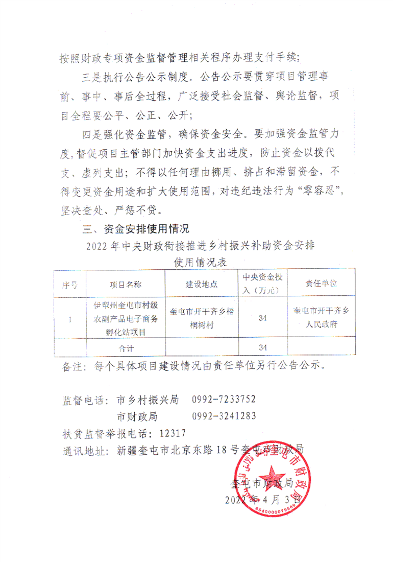 奎屯市2022年中央财政衔接推进乡村振兴补助资金安排使用情况公告公示