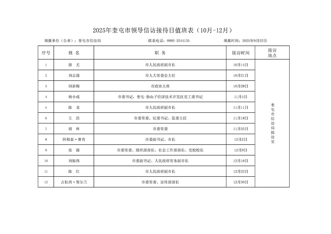 2025年奎屯市领导信访接待日值班表(10月-12月)