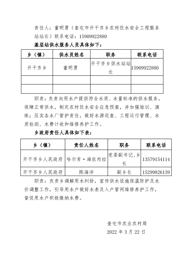 奎屯市农村饮水安全工程服务“三个责任”公示