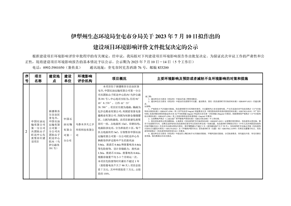 伊犁州生态环境局奎屯市分局关于2023年7月10日拟作出的建设项目环境影响评价文件批复决定的公示