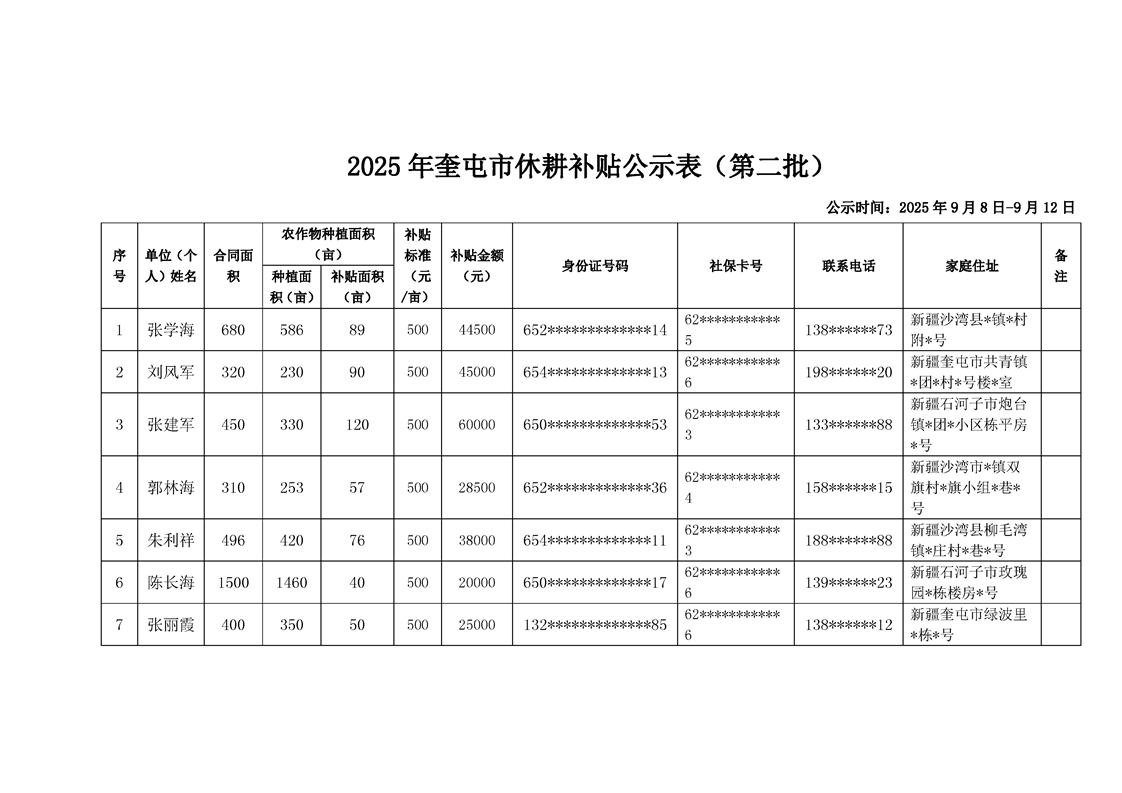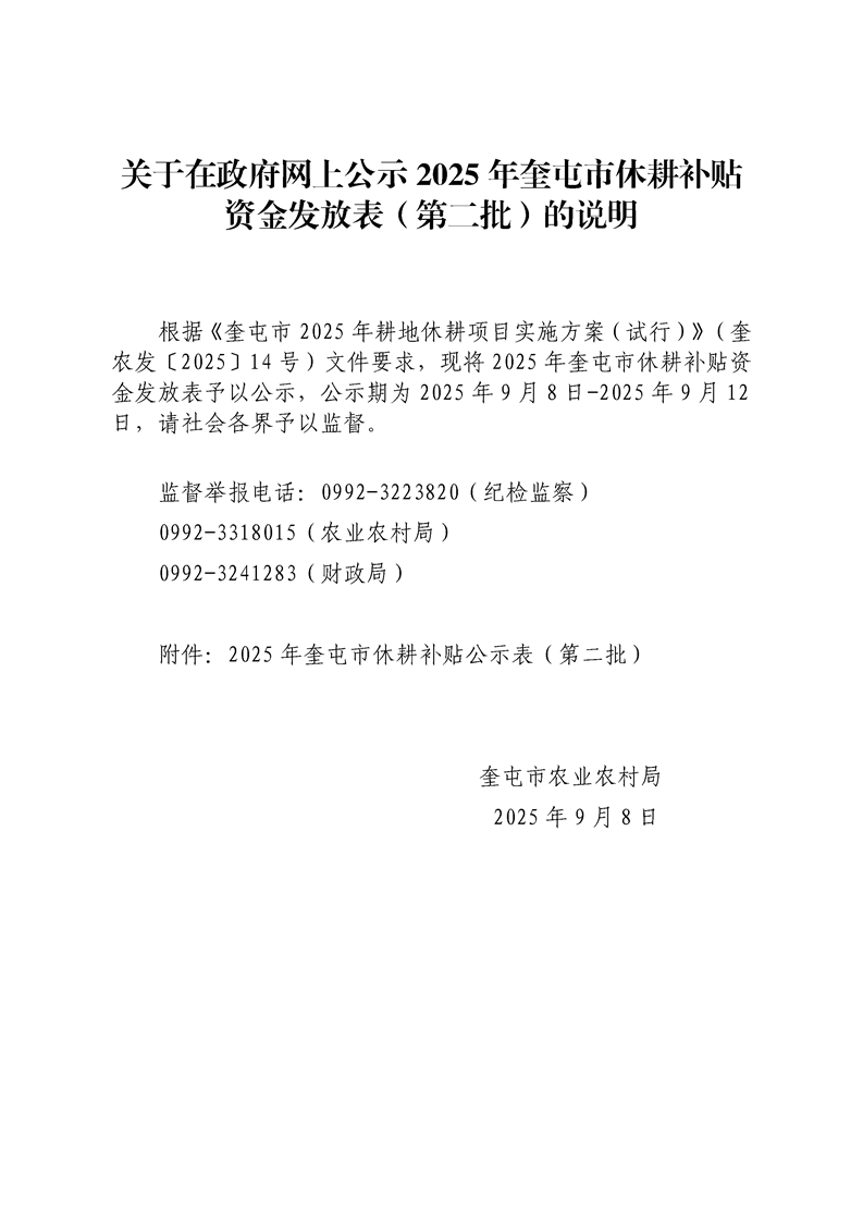 关于在政府网上公示2025年奎屯市休耕补贴资金发放表(第二批)的说明