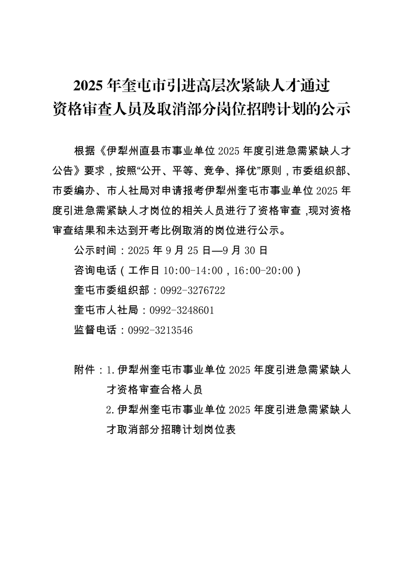 2025年奎屯市引进高层次紧缺人才通过资格审查人员及取消部分岗位招聘计划的公示