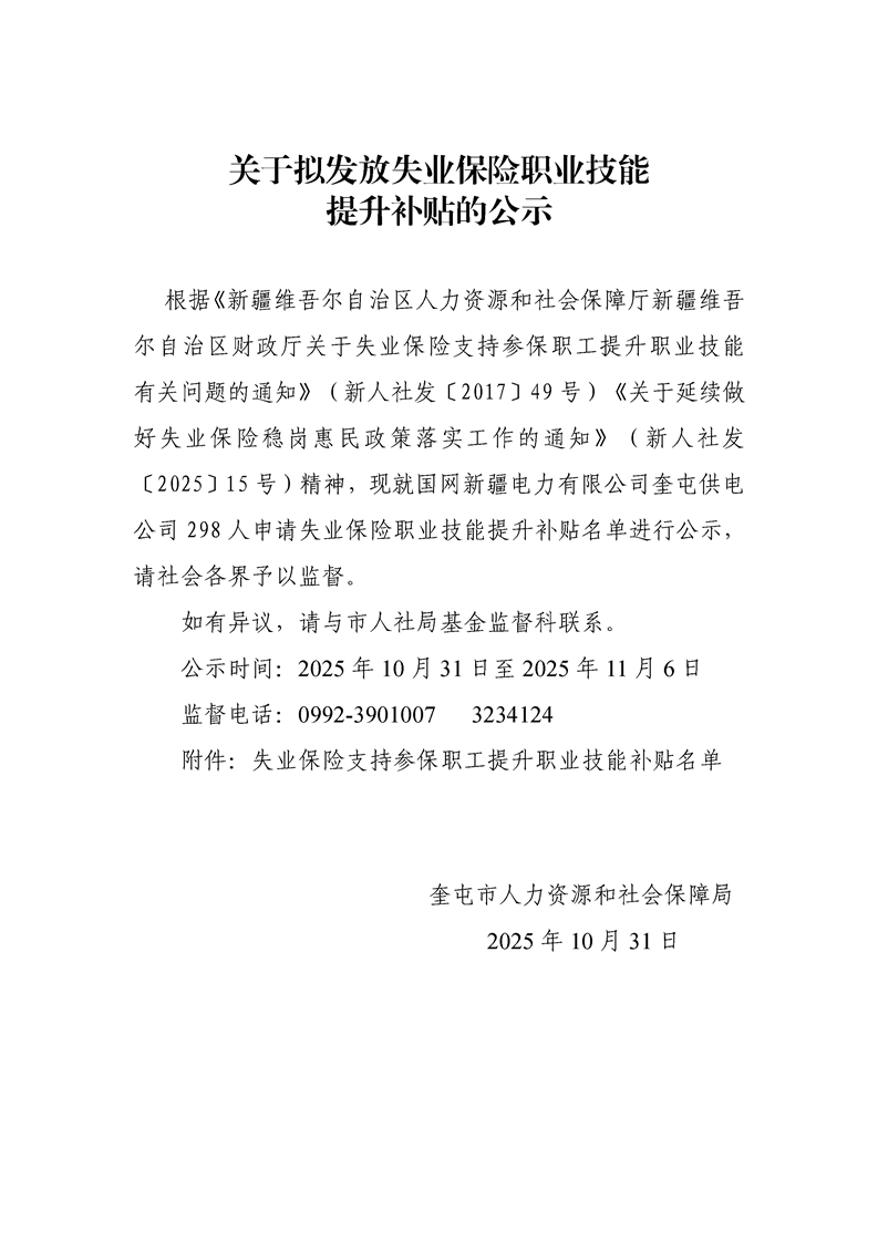 关于拟发放失业保险职业技能提升补贴的公示