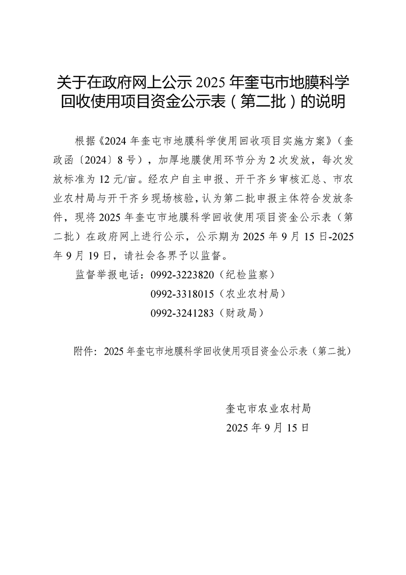 关于在政府网上公示2025年奎屯市地膜科学回收使用项目资金公示表(第二批)的说明