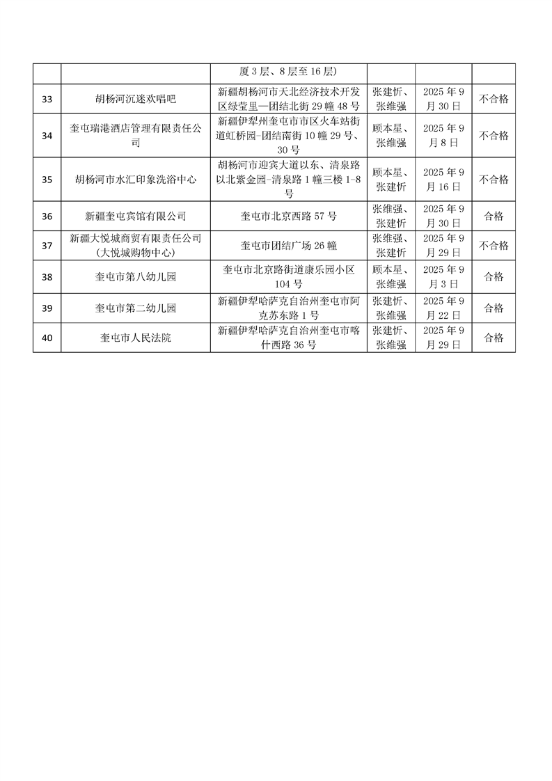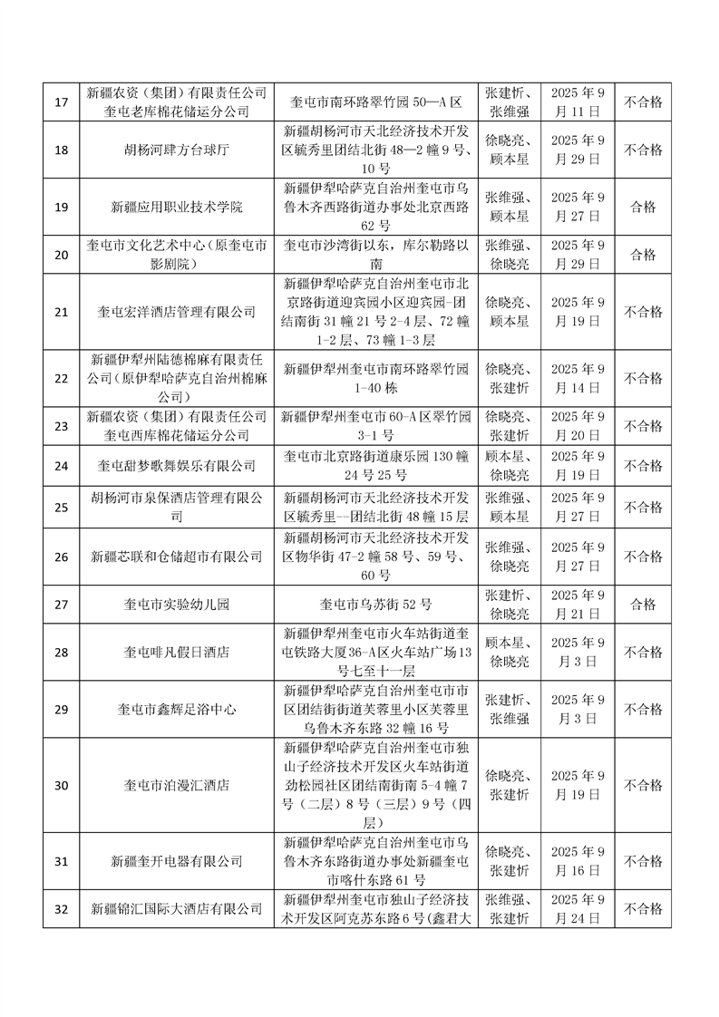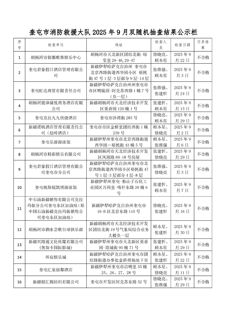 奎屯市消防救援大队2025年9月双随机抽查结果公示栏