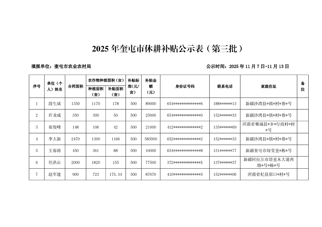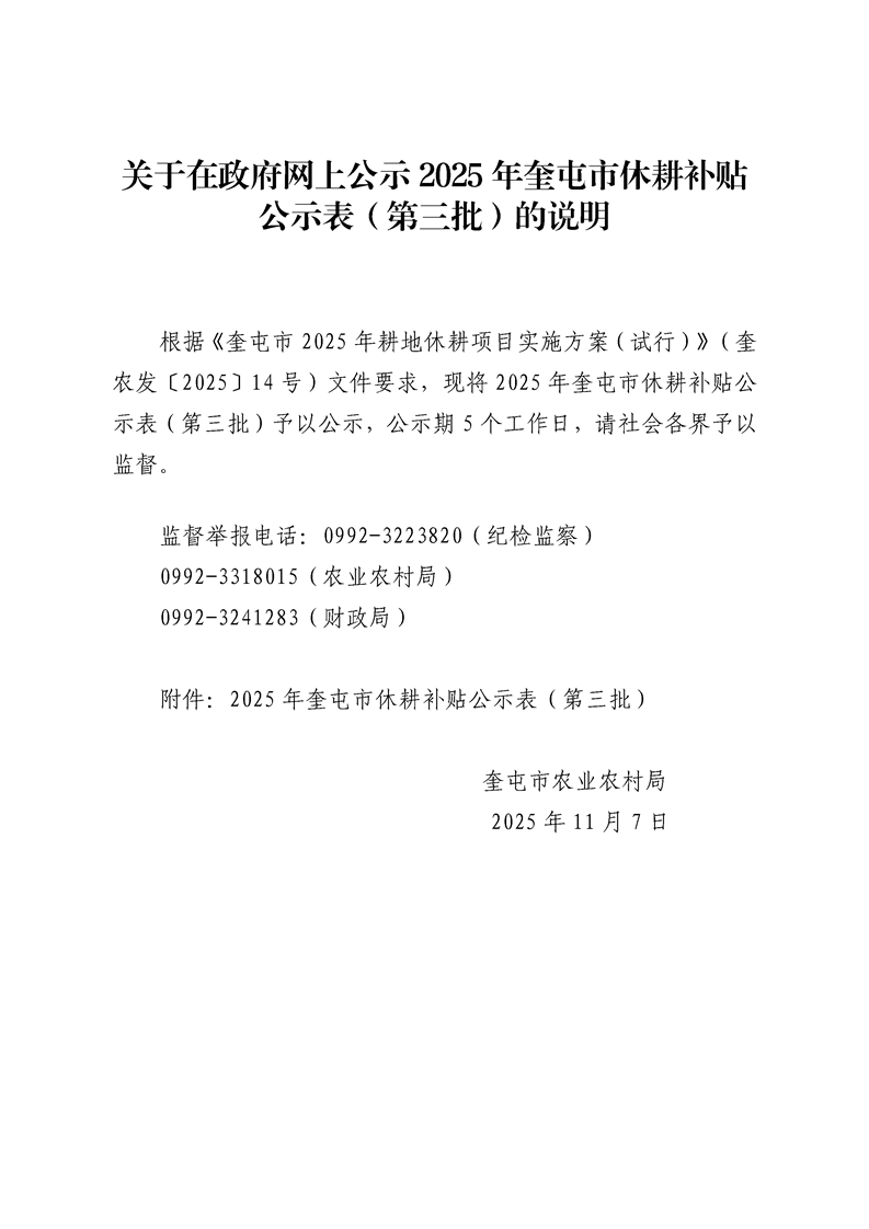 关于在政府网上公示2025年奎屯市休耕补贴公示表(第三批)的说明