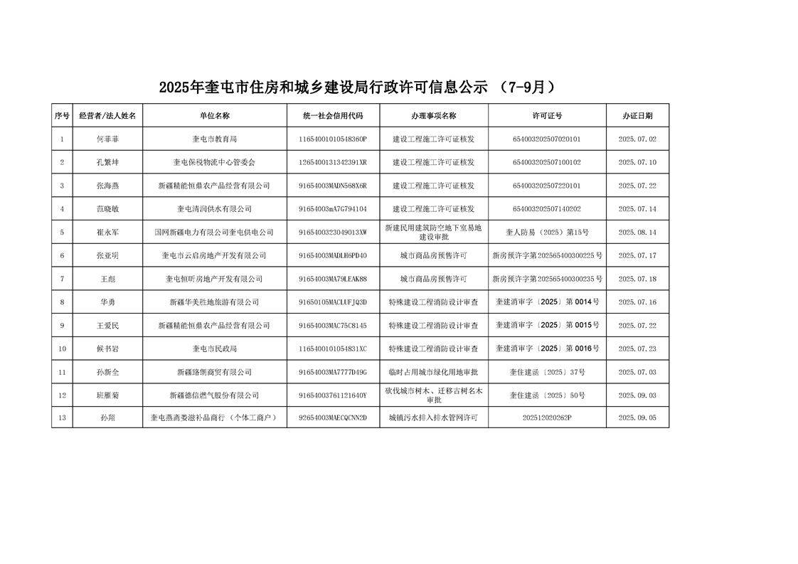 2025年奎屯市住房和城乡建设局行政许可信息公示(7-9月)