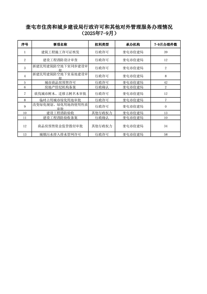 奎屯市住房和城乡建设局行政许可和其他对外管理服务办理情况(2025年7-9月)