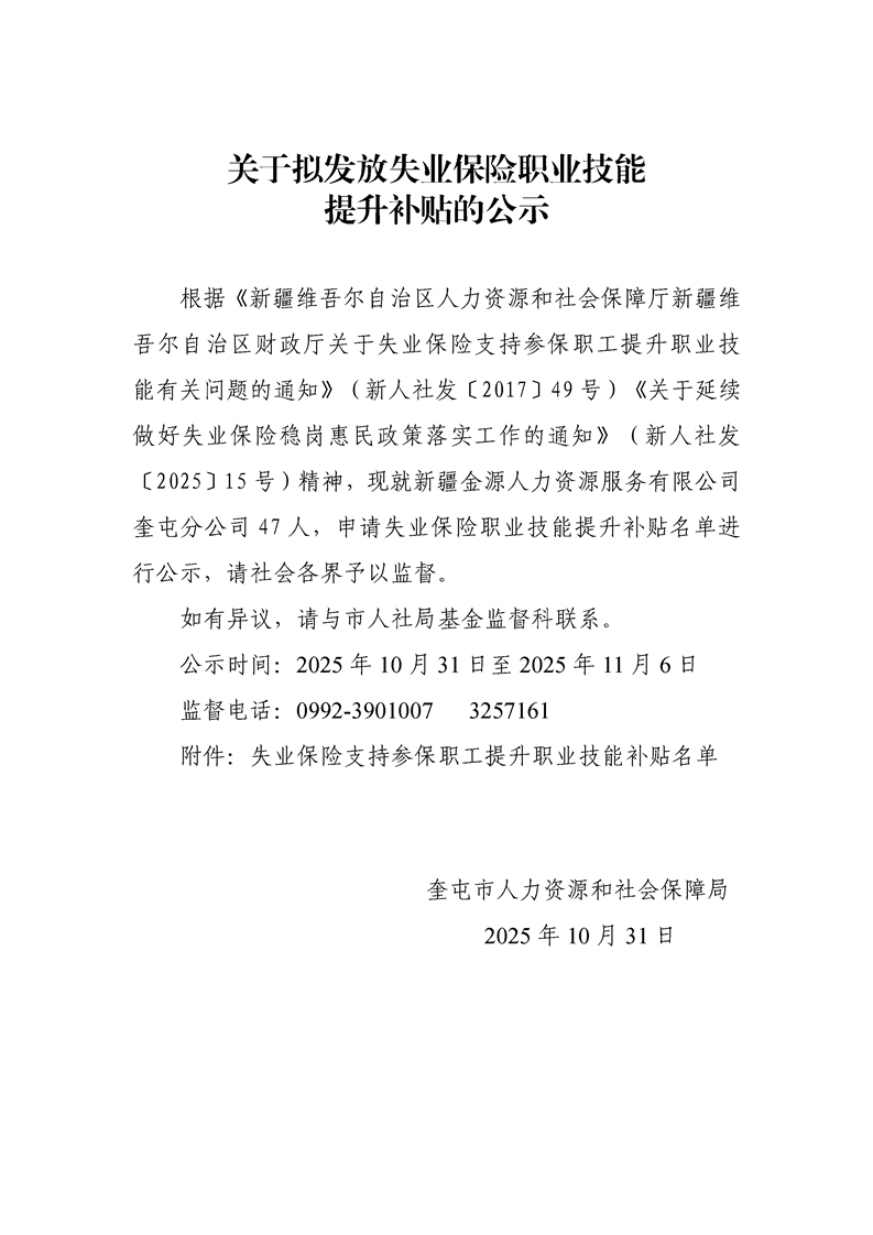 关于拟发放失业保险职业技能提升补贴的公示